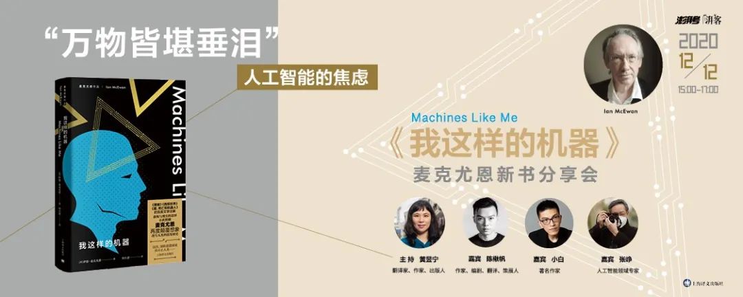 2020年,人工智能技术突飞猛进,逐渐深入人类的日常生活。人们对“AI技术”、“人工智能”、“机器人”等名词不再感到陌生。 正如《我这样的机器》中所说,“我们创造了一种有智能、有自我意识的机器,并将其推入我们这个不完美的世界。”由人类发明、设定参数的机器人,为人类服务的时候,卷入了人类的情感冲突和矛盾之中时,会带来怎样的后果? 英国国宝级作家伊恩·麦克尤恩突破个人写作的“舒适圈”,强势涉足人工智能前沿科技,创作了一部带有鲜明麦氏标签、兼具浓厚科幻色彩、“真正思考人类未来困境”的小说——《我这样的机器》。 2020年12月12日(周六)下午3点,陈楸帆、小白、张峥,这三位来自不同领域的专家、学者和作家将来到中国证券博物馆,与读者一起欣赏、探讨这部以人工智能为主题的杰出作品。本场活动将由著名作家、出版人黄昱宁主持。 活动现场将播放作者伊恩·麦克尤恩关于本书的珍贵采访视频,现场与嘉宾互动的读者更有机会获得麦克尤恩亲笔签名作品《甜牙》——见上图,如假包换的亲笔签名!“万物皆堪垂泪”:人工智能的焦虑——麦克尤恩小说《我这样的机器》新书分享会- 时间 - 2020年12月12日(周六)15:00·17:00- 地点 - 中国证券博物馆 上海市黄浦路15号- 嘉宾 - 陈楸帆 作家、编剧、翻译、策展人小白作家张峥人工智能领域专家- 主持 - 黄昱宁 翻译家、作家、出版人- 主办方 - 上海译文出版社- 嘉宾简介 - 陈楸帆科幻作家、编剧、翻译、策展人 传茂文化创始人,曾多次获得星云奖、银河奖、世界奇幻科幻翻译奖等国内外奖项,作品被广泛翻译为20多国语言,在许多欧美科幻杂志均为首位发表作品的中国作家,代表作包括《荒潮》、《人生算法》、《异化引擎》等。小白作家 小说《封锁》获第七届鲁迅文学奖,其他作品有小说《租界》、《局点》,随笔集《好色的哈姆雷特》、《表演与偷窥》等。作品被译成多国文字。张峥人工智能专家 上海纽约大学计算机科学系教授、纽约大学全球网络教授,亚马逊AWS在上海成立的人工智能研究院首任院长,国内人工智能领域专家。黄昱宁翻译家、作家、出版人 上海译文出版社副总编,翻译过F·S·菲茨杰拉德、亨利·詹姆斯、阿加莎·克里斯蒂、伊恩·麦克尤恩等多位作家作品,原创作品有《八部半》、《一个人的城堡》、《阴性阅读,阳性写作》、《变形记》、《假作真时》等。- 报名方式 - ①本次活动限量开放坐席(40人),读者扫描下方二维码报名,凭报名成功二维码即可入场。 ②请在入场处配合工作人员出示本人有效证件和“随申码/健康码”绿码,进行实名制登记。请提前完成“随申码/健康码”注册,以免临时注册造成现场人员聚集,并配合测量体温、免洗消毒液手部消毒等。 ③活动期间请佩戴口罩,并自觉与他人保持安全距离。 *报名前请认真阅读以上说明Machines Like Me《我这样的机器》[英]伊恩·麦克尤恩 著周小进 译上海译文出版社 麦克尤恩不仅是当今在世的最优雅的作家之一,更是一位擅长在日常生活戏剧性场面中刻画道德困境。 半个世纪以前,菲利普·K·迪克曾发问:‘仿生人会梦见电子羊吗?’,而如今麦克尤恩则确信这些仿生人正在我们的眼前薅羊毛。麦克尤恩的特殊贡献不在于阐述了机器人的挑战,他聪明地将这个挑战有目的性地植入了两个试图寻找生存方式的男女日常生活之中。 ——《华盛顿邮报》 1982年,平行世界的英国伦敦,彼时人工智能研究已经远远超过了我们当前的发展水平。 32岁的伦敦人查理开始了两段新的关系:一,他爱上了楼上的邻居米兰达;二,他用继承的遗产购买了一款新型人形机器人“亚当”。 “亚当”拥有以假乱真的智能和外观,能够完成逼真又不失自然的动作和表情变化。在米兰达的帮助下,查理重塑了“亚当”的性格,于是一组奇怪的三角关系渐渐形成……事情也慢慢开始失控。 麦克尤恩在小说中探讨了人类与人工智能的区别,究竟是什么使我们成为人类——我们外在的行为还是内在的生命?机器人能够明白人类的心吗?对于那些人类无法掌控的技术,这部小说将带给读者深入的思考。