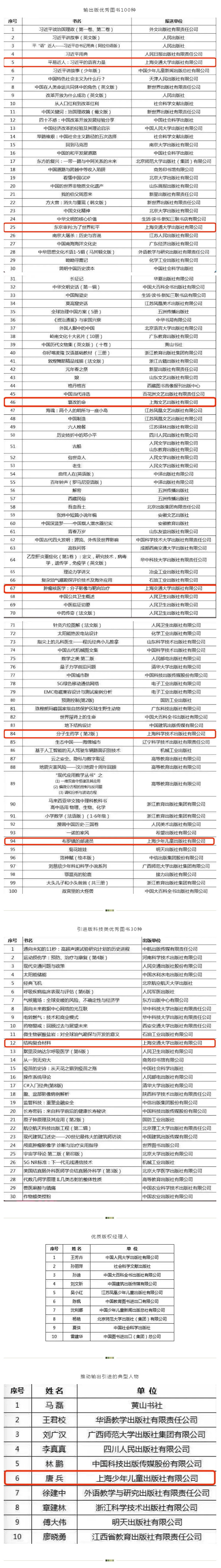 第十九届输出版引进版优秀图书推介活动评审工作于日前圆满结束。经过初评、复评、终评三轮评审,最终评选出输出版优秀图书100种,年度引进版优秀图书30种,优秀版权经理人和推动输出引进的典型人物各10名。 在本次评审中,上海交通大学出版社共入围四个项目,上海少年儿童出版社入围两个项目,上海文艺出版社与上海科学技术出版社各入围一个项目。(见下图红色框线处)