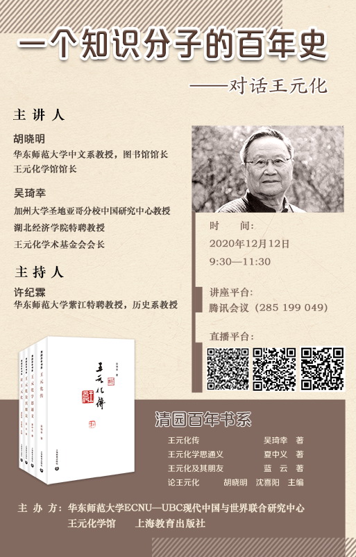 时间:2020年12月12日(星期六)上午9:30-11:30 主讲人:胡晓明 吴琦幸 主持人:许纪霖 讲座平台:腾讯会议(285 199 049) 直播平台:扫描上图中二维码
