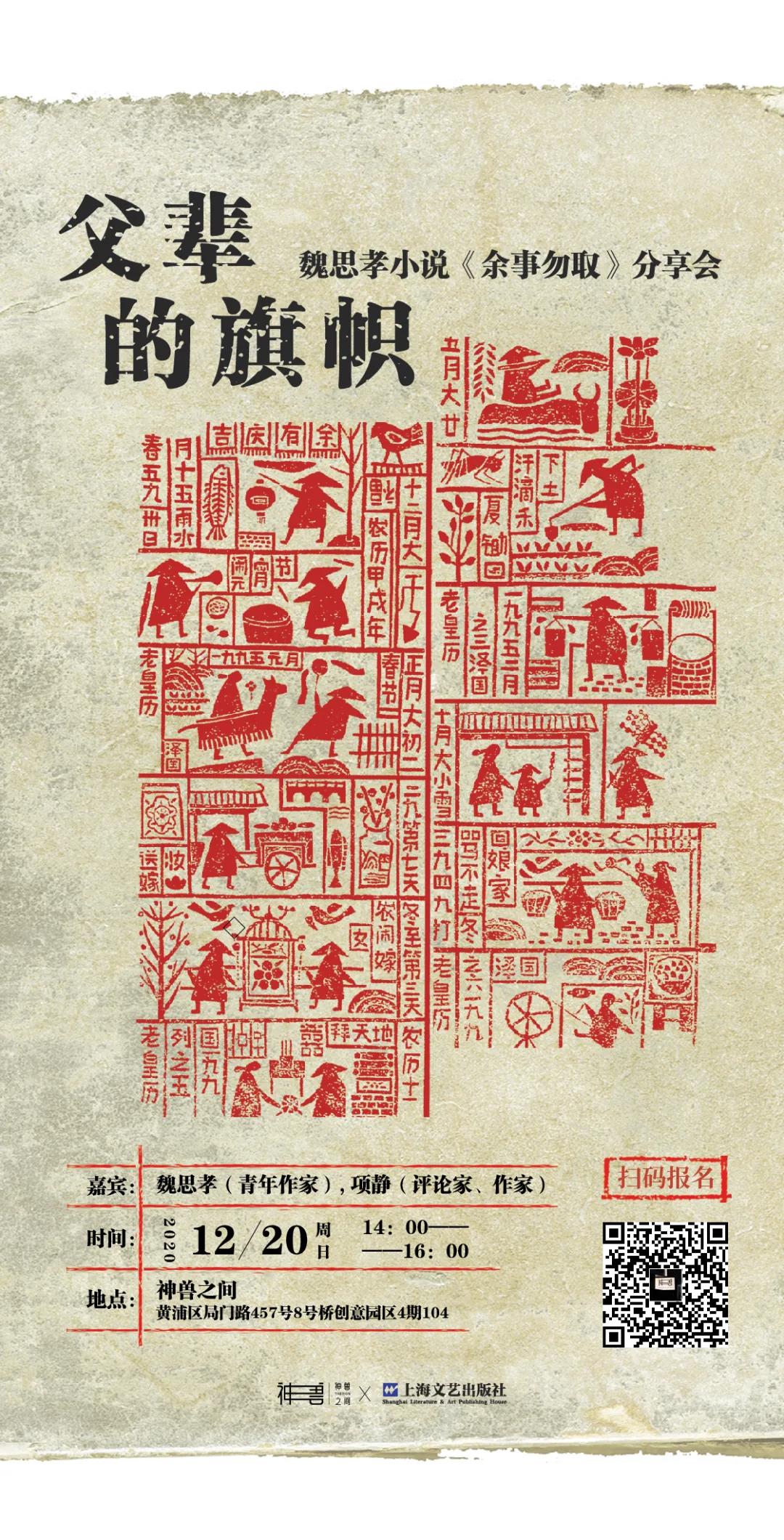 【活动主题】父辈的旗帜【活动时间】2020年12月20日14:00【活动嘉宾】魏思孝×项静【活动地点】神兽之间【嘉宾简介】 魏思孝 青年焦虑文学代表,著有《小镇忧郁青年的十八种死法》等多部作品,近期出版《余事勿取》《都是人民群众》。曾获第九届报喜鸟文学领域新锐艺术人物、山东文学新人奖、第四届泰山文学奖。 项静 评论家、作家,著有《肚腹中的旅行者》、《我们这个时代的表情》、《在结束的地方开始》,小说集《集散地》。【作品简介】 《余事勿取》是作家魏思孝成熟且动人的小说。小说的主人公卫学金是山东中部地区的一个农民,小说展现了他生命中最后三天的故事。摆在我们面前的不仅是个人的命运,还有故事背后的家庭、乡村,以及时代变迁里小人物的无所依存。魏思孝用其克制而不失悲悯的笔触,聚焦于老中青三代人,描绘出鲜活生动的鲁中的风土人情。