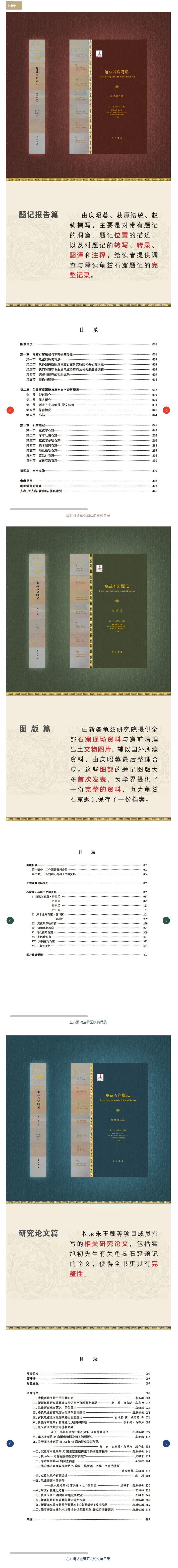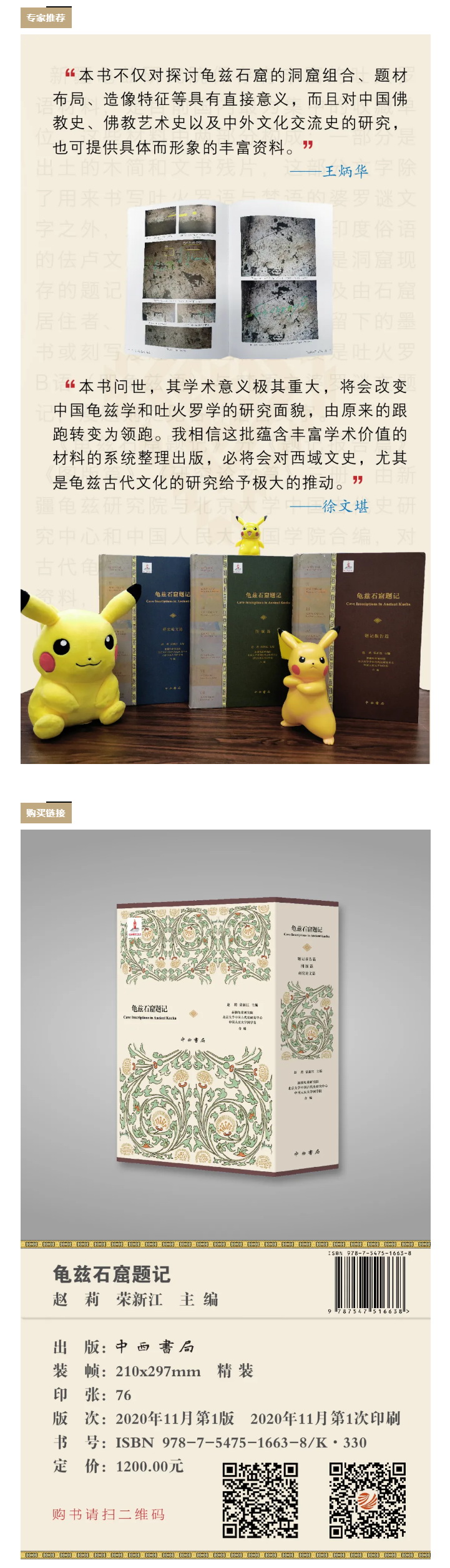 《龟兹石窟题记》(全三册)赵莉 荣新江 主编新疆龟兹研究院北京大学中国古代史研究中心中国人民大学国学院合编定价:1200.00元中西书局出版时间:2020年11月ISBN:978-7-5475-1663-8 内容简介 新疆龟兹研究院保存有丰富的吐火罗语材料,是目前国内相关材料收藏最为集中的单位。这些材料由两部分构成:一部分是出土的木简和文书残片,这部分的文字除了有用来书写吐火罗语与梵语的婆罗谜文字之外,还有少数书写梵语与印度俗语的佉卢文字;另一部分就是洞窟现存的题记,主要是壁画榜题以及由石窟居住者、参观访问者在墙壁上留下的墨书或刻写漫题。壁画榜题主要是吐火罗B语(即龟兹语)与梵语之婆罗谜文题记,漫题则泛见各种语言文字。 本书由新疆龟兹研究院、北京大学中古史研究中心和中国人民大学国学院合作,对古代龟兹王国范围内现存所有吐火罗语资料,尤其对之前较少被关注的石窟题记予以系统梳理,进行详细释读及研究,是一部具有国际学术水平的新疆现存吐火罗语文献研究的学术专著,包含文物图版、出土讯息、字样摹写、内容转写、翻译注释、综合研究、词汇索引及文物编号索引等。本书的出版,不仅将呈现中国学界在吐火罗语文献研究上的最新成果,更充分反映了新疆地区自古以来就是丝绸之路上多民族聚居、多文化交流的文明交汇之地。 作者简介 赵莉,新疆龟兹研究院研究馆员,主要从事西域佛教考古及艺术研究。著有《新疆壁画艺术——龟兹》《龟兹石窟百问》《新疆佛教遗址》《海外克孜尔石窟壁画复原影像集》;编撰出版《克孜尔石窟内容总录》《森木塞姆石窟内容总录》《克孜尔尕哈石窟内容总录》;主编《西域美术全集·龟兹(五卷本)》《龟兹石窟保护与研究国际学术研讨会论文集》等。 荣新江,北京大学博雅讲席教授,教育部长江学者特聘教授、兼任国务院学位委员会学科评议组成员,中国敦煌吐鲁番学会会长,主要从事中外关系史、丝绸之路、隋唐史、西域中亚史、敦煌吐鲁番学等研究。著有《归义军史研究》《海外敦煌吐鲁番文献知见录》《敦煌学十八讲》《中古中国与外来文明》《中国中古史研究十论》《中古中国与粟特文明》《敦煌の民族と东西交流》《丝绸之路与东西文化交流》等。 庆昭蓉,法国高等研究院历史学暨文献学部博士,专攻吐火罗语世俗文献与中古西域佛教经济。2012年从北京大学历史学系博士后出站后,担任北京大学中国古代史研究中心兼职研究员至今,同时前往法国、德国、日本等地从事出土写本调查与研究。现任日本龙谷大学古典籍暨文化财数字化典藏研究中心专任助理。著有《吐火罗语世俗文献与古代龟兹历史》。 荻原裕敏,法国高等研究院历史学暨文献学部博士,专攻吐火罗语等西域胡语佛典。历任中国人民大学国学院西域历史语言研究所讲师、京都大学白眉研究中心特定准教授,目前供职于东京大学、神户市外国语大学等研究单位。 编辑推荐 本书是我国西域考古、历史、语言研究的高水平著作,具有极高的学术价值;也是新时代石窟寺保护利用工作的最新成果,荣获2019年度国家出版基金、上海市文创基金资助。