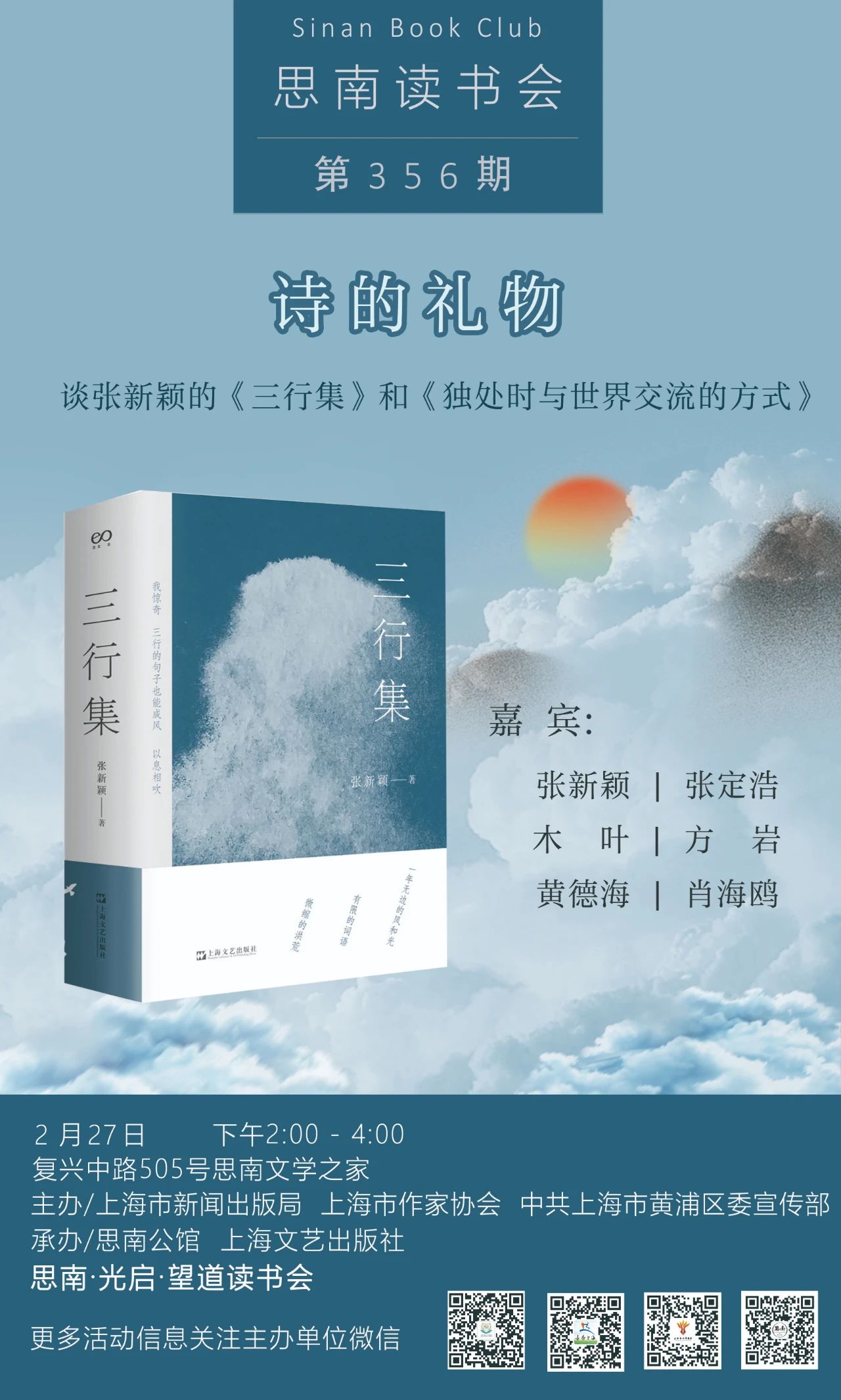 时间:2月27日(周六)14:00-16:00 地点:思南文学之家(复兴中路505号) 主题:诗的礼物——谈张新颖的《三行集》和《独处时与世界交流的方式》 嘉宾:张新颖、张定浩、木叶、方岩、黄德海、肖海鸥关于主题 诗拯救出了一些瞬间,安慰了我们。 诗人与语言交谈,但“与语言交谈,不是与语言交谈,就像与风交谈,与光交谈,与黑暗和沉默交谈”。这个周末,主办方邀请新近出版了两部诗集的张新颖先生与张定浩、木叶、方岩、黄德海、肖海鸥一起谈一谈诗的馈赠和写诗这件事。关于嘉宾 张新颖:1967年生于山东,复旦大学中文系教授,教育部长江学者特聘教授。主要作品有:中国现代文学研究著作《二十世纪上半期中国文学的现代意识》、《沈从文的后半生》《沈从文九讲》《沈从文的前半生》;当代文学批评集《栖居与游牧之地》《双重见证》《无能文学的力量》《当代批评的文学方式》《斜行线》;随笔集《九个人》《迷恋记》《有情》《风吹小集》《读书这么好的事》;诗集《在词语中间》《独处时与世界交流的方式》等。 张定浩:1970年代生于安徽,毕业于复旦大学中文系,供职于《上海文化》杂志。著有文集《既见君子:过去时代的诗与人》《取瑟而歌:如何理解新诗》《爱欲与哀矜》《孟子读法》,诗集《我喜爱一切不彻底的事物》等。 木叶:原名刘江涛。生于北京,毕业于复旦大学历史系,现供职于《上海文化》杂志。中国现代文学馆特聘研究员。著有《一星如月看多时》《水底的火焰》《先锋之刃》,编选有废名集《少时读书》和金克木集《梵佛间》。获中国时报文学奖·诗歌评审奖(2006)。诗歌收入《复旦诗选》、《2018诗歌年选》和《诗歌的纽带:中俄诗选》等。 方岩:生于1980年代,安徽人。南京大学文学博士,中国现代文学馆第四届客座研究员。现为《思南文学选刊》副主编,辽宁大学文学院特聘教授。曾获《当代作家评论》年度优秀论文奖(2014、2017)、江苏省紫金山文学奖(2017)、唐弢青年文学研究奖(2020)等,著有评论集《第一本》等。 黄德海:《思南文学选刊》副主编,《上海文化》编辑。著有《诗经消息》《书到今生读已迟》《文学的末法时代或早期风格》等,编有《书读完了》《野味读书》。 肖海鸥:《三行集》责任编辑,上海文艺出版社艺文志工作室编辑总监。关于书目《三行集》张新颖 著上海文艺出版社 张新颖教授得到朋友送的一个小本子,一页只能写三四行,出于敬惜字纸,他便以三行为限,写自由的句子,“风吹到句子之间/ 风吹词语/ 风吹到旷野和字的笔画之间”。这样写满了一年,三行的句子随四季轮换一周,于复始之际显现完整之形。这不是事先的计划,随自然流转比计划更能获得运行生息的节奏、韵律和赋形的力量。《独处时与世界交流的方式》张新颖 著华东师范大学出版社 张新颖以学者、批评家为人所知,本书却以诗歌为载体展现他纯熟的母语写作,收录其近三年的诗歌新作,并附有布罗茨基三首译诗。缘起日常,捕捉着生活中的情绪闪现,平静中又有着力量,有独自的审视,是回望也是展望,私人化又覆盖着人的共同情绪,是一本手边的诗集。