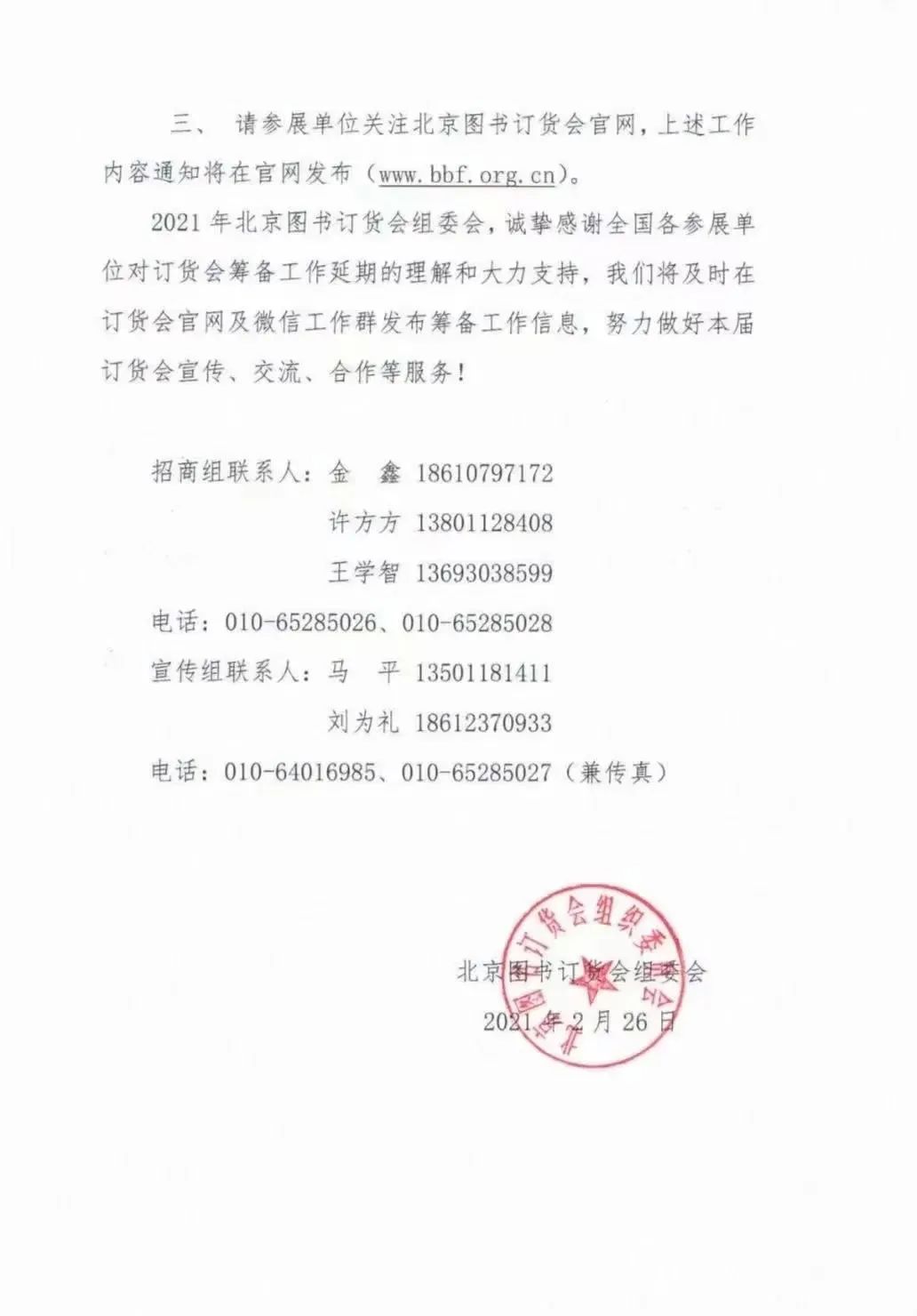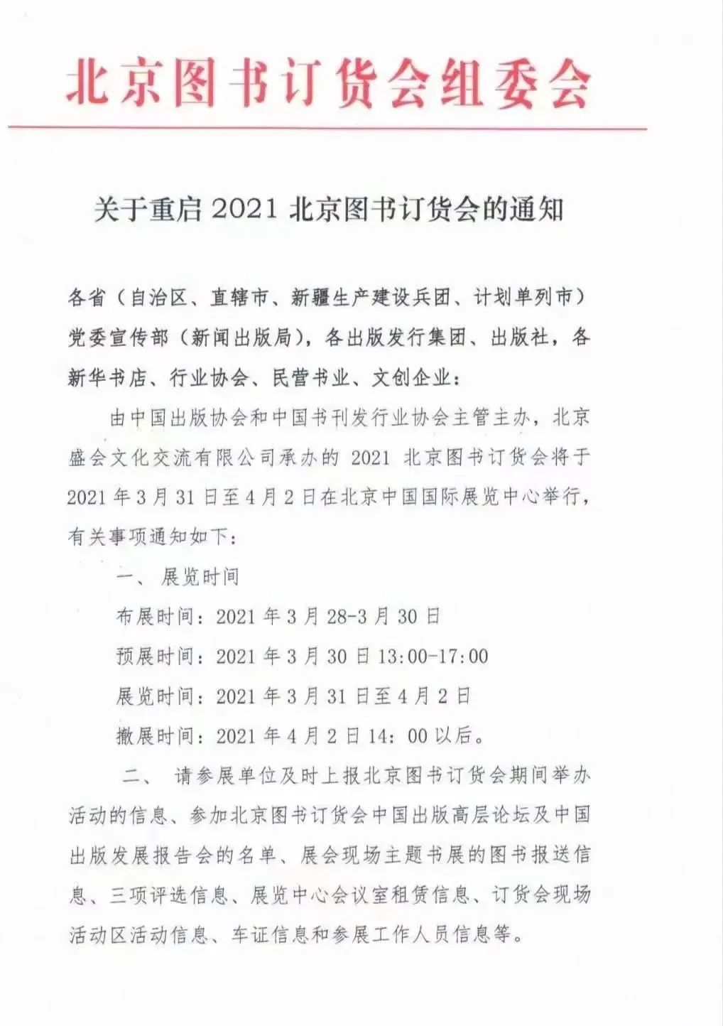 由中国出版协会和中国书刊发行业协会主管主办,北京盛会文化交流有限公司承办的2021 北京图书订货会将于2021年3月31日至4月2日在北京中国国际展览中心举行,有关事项通知如下: 展览时间 布展时间: 2021年3月28-3月30日 预展时间: 2021 年3月30日13:00-17:00 展览时间: 2021 年3月31日至4月2日 撤展时间: 2021 年4月2日14: 00以后