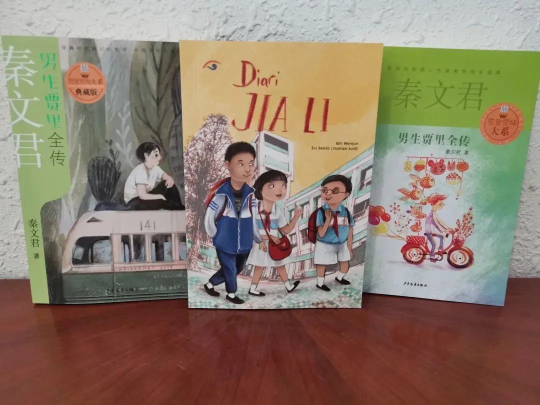 从左至右分别为《男生贾里全传》典藏版、《男生贾里全传》马来语版和《男生贾里全传》