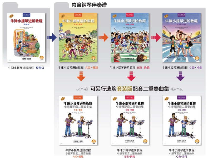 “牛津小提琴进阶教程”便是国内为数不多的小提琴系统启蒙教材,由有着434年历史的国际权威出版社英国牛津大学出版社出版,上海音乐出版社引进。该教材是英国牛津大学出版社最为畅销的小提琴启蒙教程,包括预备级、A级·慢跑、B级·快跑、C级·冲刺以及小提琴配套二重奏曲集,由凯西·布莱克威尔、戴维·布莱克威尔创作,上海师范大学小提琴教授刘洪与旅英小提琴家孙萍翻译。