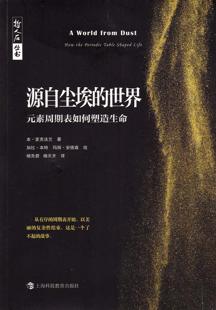 本·麦克法兰在《源自尘埃的世界》中追溯了数十亿年的进化史,以元素的数学作为开头,以人类的发展作为结尾。在这个故事中,元素周期表可以帮助我们看到新事物。世界就像是建立在地质学基础上的舞台。流水不断浸蚀山脉中的岩石,将矿物质转移进化学,并为远古生命提供化学护盾。在这种环境下,一系列化学规则不断提升生物的复杂性。随着细胞构成生物和生态系统,五颜六色的分子捕获了太阳的能量,并释放氧气。氧气是一个关键因素,它改变了世界,并使元素周期表中的一些元素按照可预测的顺序不断被生命利用。这些事件在版画家加拉·本特和医学插画家玛丽·安德森创作的40幅原创插图中得以生动体现。
