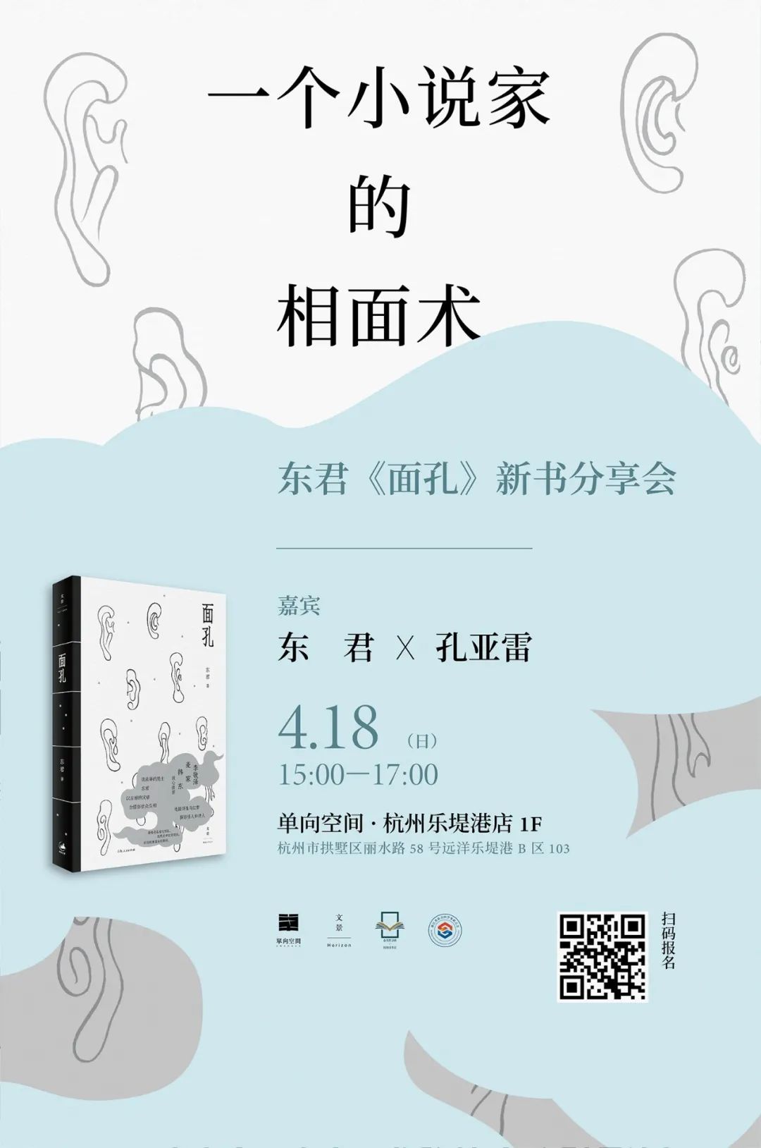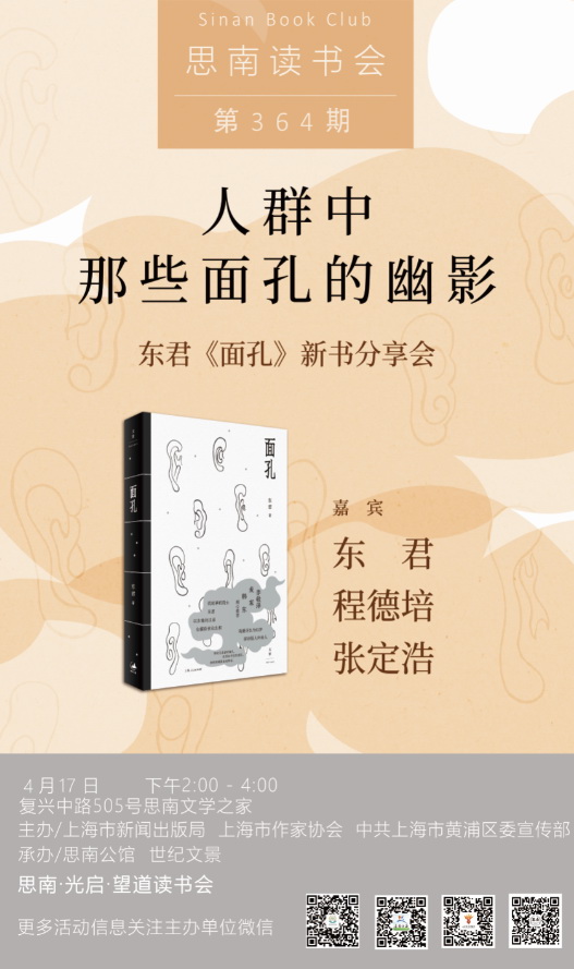 作家东君的新书《面孔》,收入的四篇小说均有笔记小说的特点,叙事志人,只寥寥几笔,却风神能见。面呈异相的人、行为怪诞的人、分不清梦境与现实的人、默默无闻的诗人……他们注定湮没于历史,游走在烟火人间,与面具共生,与影子缠斗。如同一个冷静的旁观者,东君以古雅的汉语白描俗世众生相,在看似不经意的闲话漫谈间,那些无名之辈的面孔便如幽灵般一一浮现。 你可以说它像小说,像散文,像诗歌,也可以说三者都不像。作者东君想寻找这样一种小说:它有小说的外衣、散文的躯壳、诗歌的灵魂。他给自己设置了人称、篇幅等限制,但又以此抵达了写作的敞开与自由。东君以速写笔法召唤出数百张无名者的面孔,捕捉他们某一瞬间的动态,就像庞德的《地铁车站》:“人群中这些面孔幽灵般显现;湿漉漉的黑枝条上朵朵花瓣。” 2021年4月17、18日,东君将在上海、杭州,分别与评论家程德培、张定浩,小说家孔亚雷,从《面孔》展开漫谈。上海站人群中那些面孔的幽影 ● 时间:2021年4月17日(周六)下午14:00—16:00 ● 地点:思南文学之家(上海市复兴中路505号) ● 嘉宾:东君 程德培 张定浩 ● 主办:上海市新闻出版局、上海作家协会、中共上海市黄浦区委宣传部 ● 承办:思南公馆、世纪文景嘉宾简介 东君 1974年出生于浙江乐清,主要从事小说创作,兼及诗与随笔,偶涉戏剧。曾获郁达夫小说奖、茅盾文学新人奖、《十月》文学奖、《人民文学》短篇小说奖等。 程德培 1951年生于上海,籍贯广东中山。自1978年始从事文学评论和研究工作,发表论文及批评文字约300万字。著有《小说家的世界》《小说本体思考录》《33位小说家》《当代小说艺术论》《谁也管不住说话这张嘴》等。曾获第六届鲁迅文学奖等。 张定浩 1970年代生于安徽,供职于《上海文化》杂志。著有文论随笔集《既见君子:过去时代的诗与人》《取瑟而歌:如何理解新诗》《爱欲与哀矜》《无形之物》,诗集《我喜爱一切不彻底的事物》等。杭州站一个小说家的相面术扫描上方二维码 即可报名 ● 时间:2021年4月18日(周日)15:00—17:00 ● 地点:单向空间·杭州乐堤港店 1F(杭州市拱墅区丽水路 58 号远洋乐堤港 B 区 103) ● 嘉宾:东君、孔亚雷 ● 主办:世纪文景、单向空间、钱报读书会嘉宾简介 东君 1974年出生于浙江乐清,主要从事小说创作,兼及诗与随笔,偶涉戏剧。曾获郁达夫小说奖、茅盾文学新人奖、《十月》文学奖、《人民文学》短篇小说奖等。 孔亚雷 1975年生,小说家、翻译家,著有长篇小说《不失者》《李美真》,短篇小说集《火山旅馆》,译有保罗·奥斯特长篇小说《幻影书》,杰夫·戴尔《然而,很美:爵士乐之书》,詹姆斯·索特长篇小说《光年》等。有作品被译为英、荷、意等国文字。曾获西湖中国新锐小说奖、鲁迅文学奖翻译奖提名奖、单向街书店文学奖“年度文学翻译奖”。他住在莫干山下的一个小村庄。图书介绍《面孔》2021年3月东君 著李敬泽、麦家、韩东倾心推荐。人心不同,各如其面。接续中国笔记小说传统,当代文体破界创新之作。以古雅的汉语白描俗世众生相。连接浮生与幻梦,探访怪人和诗人。