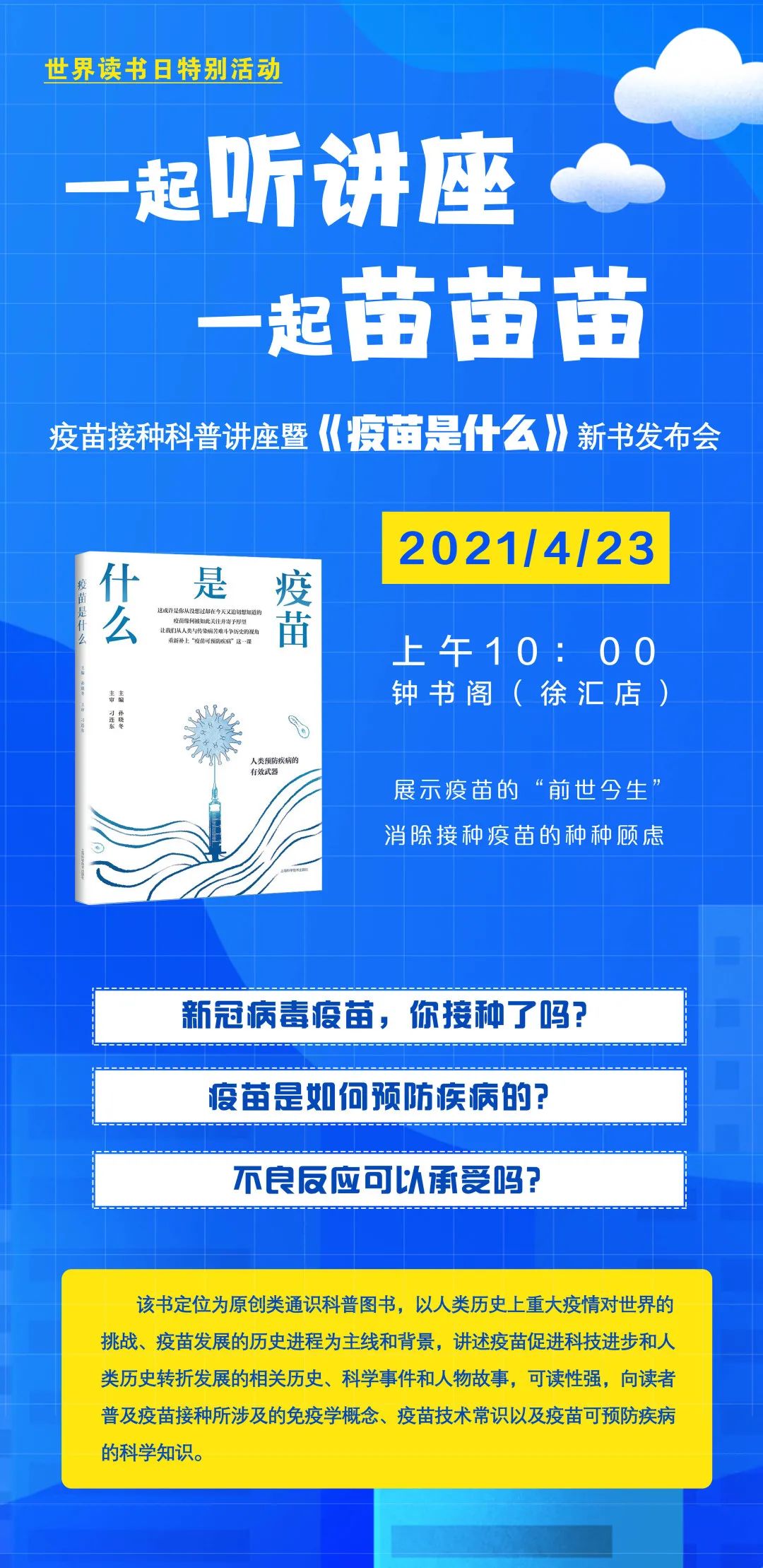 2021年4月23日上午10:00,在2021年全民阅读日到来之际,上海科学技术出版社“汇科普·读书会”在上海徐汇区科学技术协会、钟书阁徐汇店、斜土街道新时代文明实践分中心、斜土街道图书馆的支持下,假座钟书阁徐汇店,邀请《疫苗是什么》的两位主力编写者──浦东新区疾控中心免疫规划科的邓鹏飞医生、陈琳琰医生,就目前广大市民朋友们比较关心的新冠疫苗接种事宜解疑答惑,并向广大市民朋友们推荐疫苗科普新书──《疫苗是什么》,参与互动的读者朋友更有精美礼品相送,欢迎广大市民朋友莅临参与。