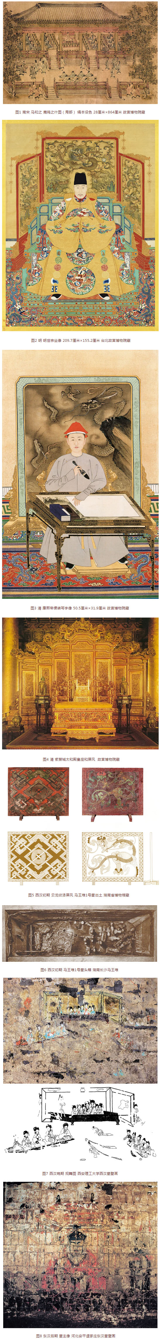 与礼仪中的其他陈设相比——无论是成排的几案还是众多的器具——这面屏风有着不可取代的独特的象征意义和构图功能。概括地说,它既是一个独立的权力象征,又是天子身体的延伸。作为权力象征,它处于典礼场所的焦点,同时也确定了画面焦点;作为天子身体的延伸,它也有一张“面孔”,在典礼中与周天子的脸庞方向一致,共同被人瞻仰。天子和屏风在人们的视线中合二为一,作为一个整体君临天下。这也是为什么之后的许多皇帝肖像,不管画的是明代的世宗还是清代的康熙,都以一面硕大的屏风衬托圣容(图2,图3),以及为什么紫禁城中轴线上的皇帝宝座都背靠辉煌的金漆龙屏,即以此象征天子至高无上的地位(图4)。