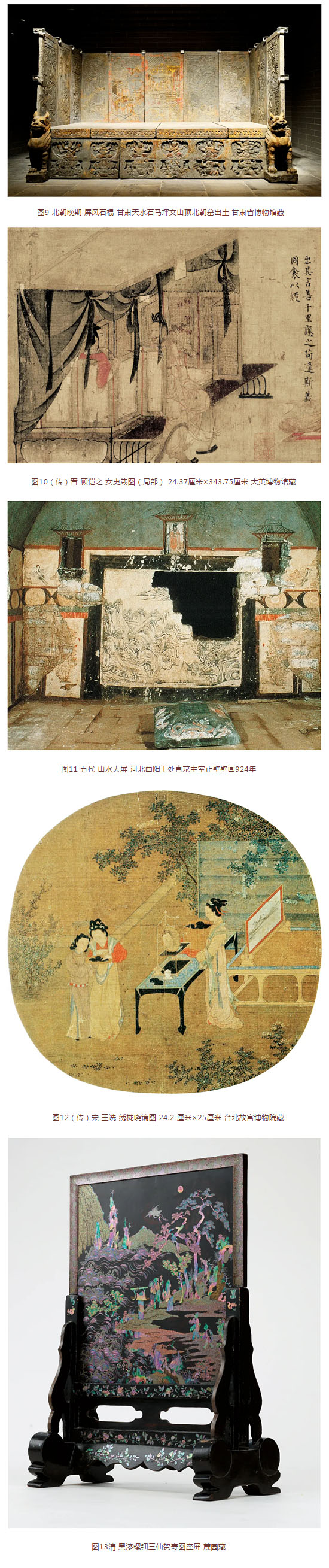 “一”字形和三扇式座屏这两种基本形式在宋元时期继续流行,但在细部结构上变得更为细腻复杂。从屏前设榻到屏前设椅的变化显示出屏风与人身体之间关系的一个重要改变。这一时期的屏风也更频繁地出现在室外空间里,如北宋官方建筑规范《营造法式》中所说的“照壁屏风骨”即为一例。新的屏风样式还包括南宋时出现的中高旁低的“山字屏”,以及样式越来越丰富的小型屏风。后者如床榻上放置的“枕屏”,时人认为有“育神定魄”的功用,见于当时的绘画之中(图12)。