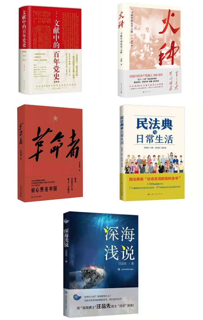 2021年是开启全面建设社会主义现代化国家新征程、向第二个百年奋斗目标进军的新的历史起点,上海世纪出版集团为党的百年大庆记载伟业、展示辉煌,深入挖掘上海“党的诞生地”“初心始发地”红色文化资源,生动鲜活讲好中国共产党故事,连续推出《文献中的百年党史》(上海人民出版社·学林出版社)《火种:寻找中国复兴之路》(上海人民出版社)《革命者》(上海文艺出版社)《民法典与日常生活》(上海人民出版社)《深海浅说》(上海科技教育出版社)等一批有内涵、有影响、有价值的主题出版力作,并联手一流作者和社会各界,创新图书宣传和社会服务手段,全力扩大主题出版“世纪传播路径”。