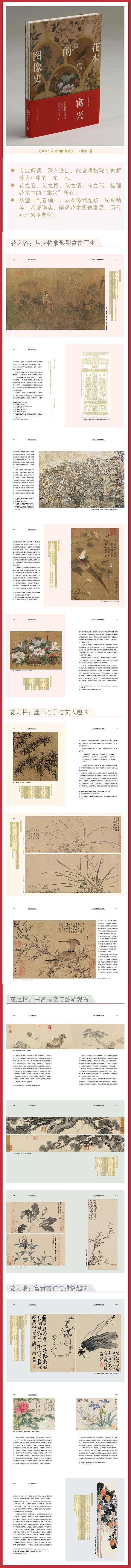 《寓兴:花木的图像史》 王中旭 著 本书的写作建立在作者参与主持、筹备2019年故宫博物院午门年度大展“万紫千红——中国古代花木题材文物特展”的基础上。按时代与风格依次将花木画的发展分为:花之容、花之格、花之情、花之瑞四个部分,通过图像与文字,阐述花木画自唐代发展至宋代,再至元明清的发展历程,包含了石刻线描、壁画、卷轴画诸多形式。同时,作者以“寓兴”为题,指出古代画家往往在所画花木上寄寓、投射以人的情感、品格。四个章节环环紧扣主题,使得每一时代画家对花木寄托的感情、品格得以体现,展现了一部花木画发展的图像史。