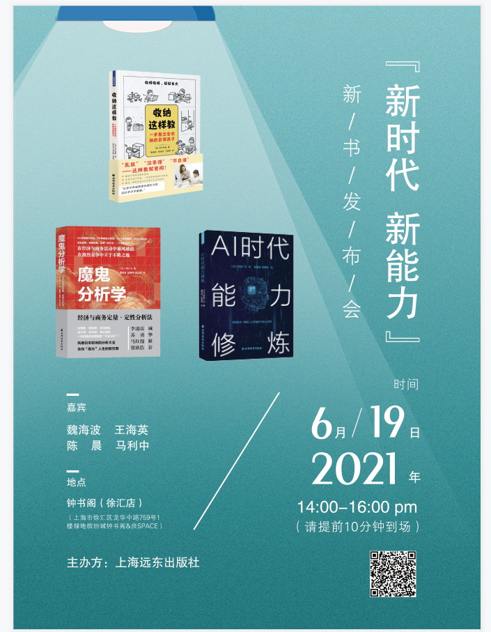 新时代的个人成长,需要什么样的能力修炼?新时代的职场驰骋,需要什么样的工具助力?新时代的亲子教育,需要什么样的收纳教育? 欢迎参加6月19日在钟书阁(徐汇店)举行的《AI时代能力修炼》《魔鬼分析学:经济与商务定量·定性分析法》《收纳这样教:一步教出会收纳的自律孩子》新书发布会,聆听专家学者解读科技革新与个人成长、分析能力与职业发展、育儿收纳与成长教育的密切关系。活动预告 活动主题:“新时代·新能力”新书发布会 主办方:上海远东出版社 嘉宾:魏海波 王海英 陈晨 马利中 时间:2021年6月19日下午14:00-16:00(请提前10分钟到场) 地点:钟书阁(徐汇店)先锋书屋(上海市徐汇区龙华中路759号1楼绿地缤纷城钟书阁&先锋书屋)图书简介《AI时代能力修炼》【日】田坂广志 著魏海波 陈海燕 译上海远东出版社 2021年1月定价:38.00元 AI时代你必须修炼的生存能力!修炼逆境观,学通共情秘籍,掌握夜间成长法,转AI失业危机为能力修炼良机,穿越AI革命风暴,超越经验型智慧,拥抱AI时代的大变革!《魔鬼分析学:经济与商务定量·定性分析法》【日】中村 力 著魏海波 赵静玮 赵力婷 译上海远东出版社2021年6月定价:78.00元 从跨国商业订单的接拒到超市高级红酒附近商品的摆放;从业务扩大是否新建厂房的提议到便利店午餐便当的备货;从资源开采盈利性的评估到印刷公司兼职员工的聘用……《魔鬼分析学》里24种定量分析法、28种定性分析法、34个实用案例、200+知识点,组合应用,无限拓展。不管你是职场小白还是商业精英,不论你是底层“打工人”还是高层“决策者”……对所遇到的问题进行有效的分析和解决,合适的方法定能助你——在经济与商务活动中乘风破浪,在激烈竞争中立于不败之地。《收纳这样教:一步教出会收纳的自律孩子》伊东裕美 著魏海波 杨本明 王睿华 译上海远东出版社2021年4月定价:48.00元 《收纳这样教》这本好用的收纳教育书,正是父母的好帮手。作者伊东裕美是日本知名收纳师,也是三个孩子的母亲。她用亲身经历告诉读者:只要设计一些适合孩子做整理的结构,用轻松趣味的方式提醒督促,孩子很快就能养成做整理的习惯。做整理的基本要领、让孩子独立做整理的步骤、不同物品的收纳方法等,尽在书中呈现。