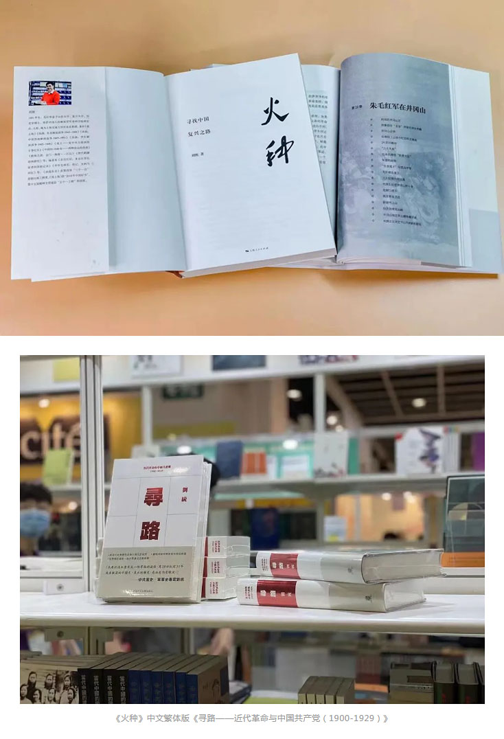 近日,《火种——寻找中国复兴之路》“走出去”工作取得新进展。《火种》中文繁体版《寻路——近代革命与中国共产党(1900-1929)》由香港中文大学出版社出版,并在第31届香港书展上亮相。《火种》俄文版入选2021年度丝路书香工程项目,将由俄罗斯-学术研究出版社(Russian Academic and Research Press)于2022年底前出版;英文版入选中宣部“庆祝中国共产党成立100周年主题图书对外出版”专项翻译资助,英文译稿由美国汉学家、新加坡南洋理工大学翻译系白雪丽教授翻译中,年内由加拿大-皇家柯林斯出版集团(Royal Collins Publishing Group Inc.)出版。