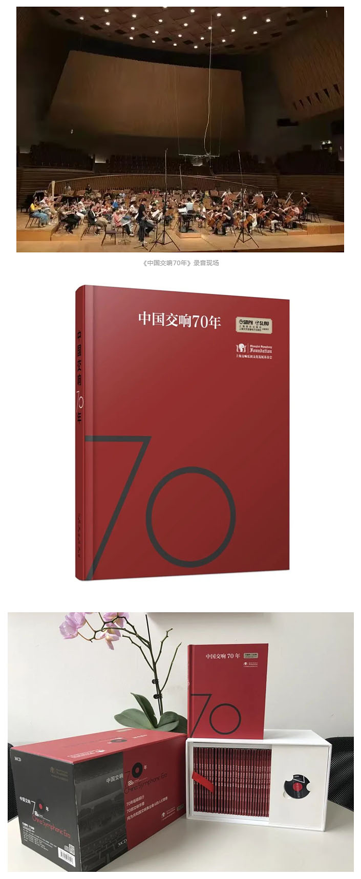 《中国交响70年》由上海音乐出版社、上海文艺音像电子出版社出版,是中国第一套以编年体形式出版的交响音像制品,收录了1949年至2019年间中国作曲家的70部优秀交响乐作品,记录了新中国交响乐70年来成长壮大的步履和足迹,是中国社会音乐文化进程的生动映照。