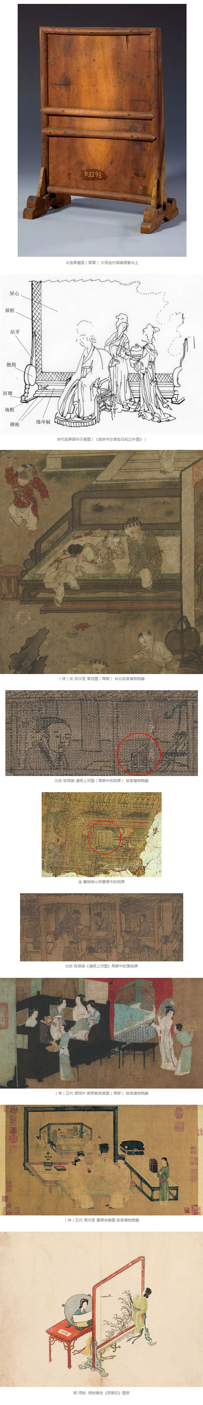 从家具的角度讲,屏分为两种:座屏和围屏。座屏是平面的屏风下面带有底座,围屏是横向的、可以折叠起来的屏风。从屏风本身来看,屏芯是最重要的,但是家具史上一直关注的是屏芯之外的内容,如屏风的造型,屏芯外的屏框是怎样把屏芯框起来的,有了屏框以后什么部件能让它立起来,等等。张志辉将屏的组成部件一一介绍,并以《清明上河图》《韩熙载夜宴图》《合乐图》等为例,从宋画中的诸多屏风作品可以看出屏在宋代生活中的重要地位。
