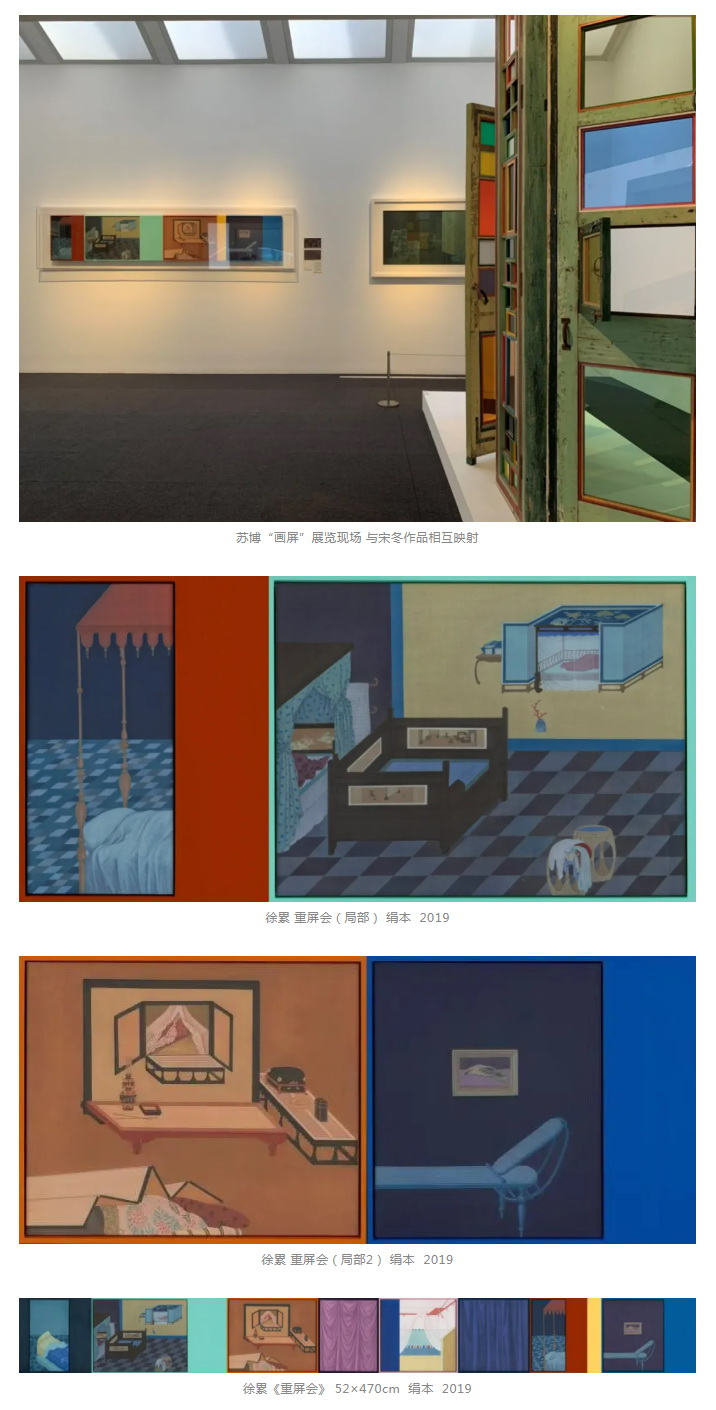 如果说郑岩与张志辉两位学者关注屏的前生,那么徐累则将艺术家的目光聚焦于屏的今世。作为“画屏:传统与未来”的参展艺术家之一,徐累对屏的兴趣从屏所涉及的空间、时间、虚实关系的转换层面展开,在其绘画中对与屏相关的形式及概念进行延伸、扩展,通过当代艺术创作让更多的人了解屏风的意义,创造了一种兼及传统与当下、叙事与想象的艺术风格。