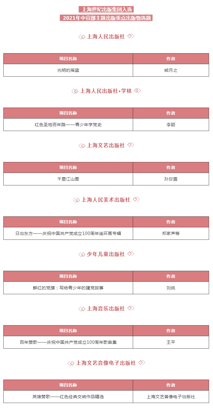 中宣部办公厅近日公布2021年主题出版重点出版物选题。根据《中央宣传部办公厅关于做好2021年主题出版工作的通知》,各地区各部门各出版单位精心组织上报主题出版选题2232种,其中图书选题1934种、音像电子出版物选题298种。经评审,最终确定2021年主题出版重点出版物选题170种,其中图书选题145种、音像电子出版物选题25种。 上海世纪出版集团7种入选。其中,上海人民出版社2种,上海文艺出版社1种,上海人民美术出版社1种,少年儿童出版社1种,上海音乐出版社1种,上海文艺音像电子出版社1种。