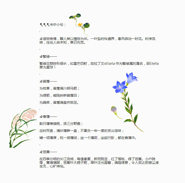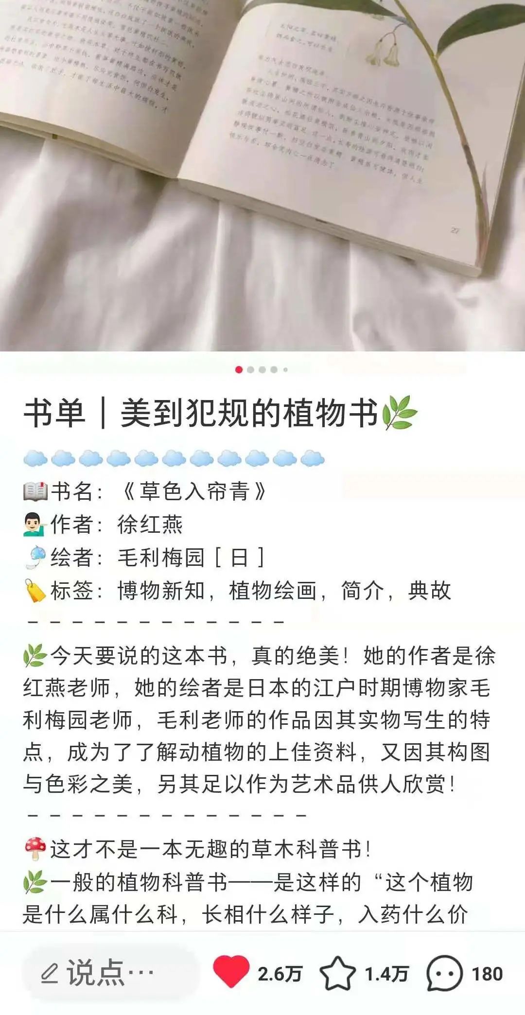 最近,《花开不记年》和《草色入帘青》这两本高颜值的彩图书在小红书火了。 起因是一位读者的晒书,她称《草色入帘青》为“美到犯规的植物书”,文章中更是“夸夸”不绝,除了夸“构图与色彩之美”,还因为它“不是一本无趣的草木科普书”,她说自己曾经多次被一般的植物科普书那种教科书式的枯燥打败。 在《草色入帘青》这本书中,虽然也会涉及“这个植物是什么属什么科,长相什么样子,入药什么价值”这些内容,但作者参杂了一些古今中外对这种植物的典故,用法,小故事等,还有植物的英文名,名家的诗词,佐以美丽生动词汇的描述,这样读起来不会索然无味,却觉得文字配着绘图相得益彰! 作者还提到图文排版和目录,给书整体加分不少。 甚至精心抄录了书中美好的小句子。 这篇笔记因为作者真心的喜爱与用心,一下子得到了2.6万点赞,和1.4万的收藏,许多人都在问怎么购书。 随后又有网友发现了这本书的姊妹书《花开不记年》,也晒出了自己的读书感受。 “这是一本让人想要带着出门的书,每看到一朵花,就可以对照着好好了解一番。” “若在辛苦拼杀的日常中倍感疲惫,不如与自然相期以花,为花驻足,为花停留,为花不知迷路,为花开而忘却流光。” 接着,陆续有被“种草”的网友晒单了自己的“真香”笔记。 被夸得最多的,当然是这两本书的“高颜值”。 还有不少读者特地提到装帧方式——裸脊锁线装,可以180°平摊,特别让人喜欢。 《花开不记年》和《草色入帘青》都属于“草木闲趣书系”,作者徐红燕为那些知名的和不知名的花儿草儿们各书写一部小传,书中流淌着对自然草木的一腔挚爱。 每本书涵盖了100种植物,种类之多,用心之细,让读者们觉得“大开眼界”。 如得浮生半日闲,不妨清茗一壶,一册在手,赏一幅梅园手绘图,读半卷花草蔬木文,静享流年~ 如果你也对这套书感兴趣,不妨也在这炎炎夏日翻开这套让人满目绿意的书吧!《花开不记年》徐红燕 著 [日]毛利梅园 绘上海科技教育出版社定价:68.00元《草色入帘青》徐红燕 著 [日]毛利梅园 绘上海科技教育出版社定价:68.00元