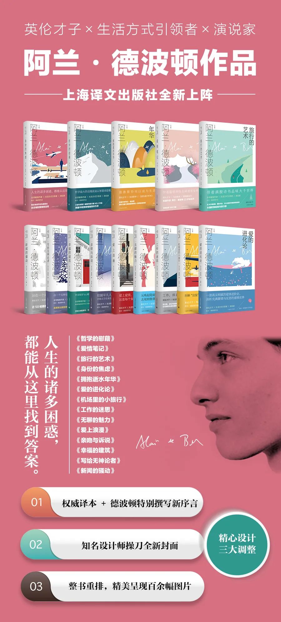除了《新闻的骚动》,阿兰·德波顿还写了13本关于生活的“答案之书”:《身份的焦虑》、《哲学的慰藉》、《旅行的艺术》、《工作的迷思》……每一本都回答了一个你非常关心、但无从解答的问题。