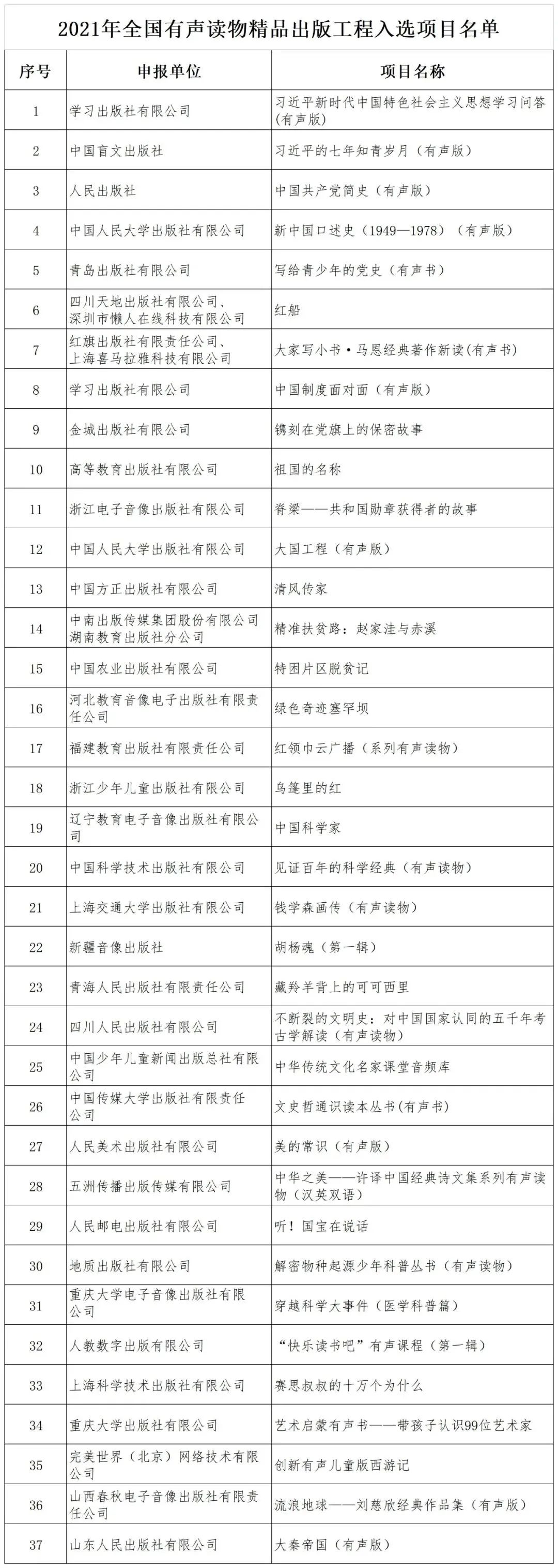 根据《国家新闻出版署关于申报2021年全国有声读物精品出版工程项目的通知》,经工程评审办公室组织专家严格评审遴选,拟确定学习出版社有限公司《习近平新时代中国特色社会主义思想学习问答(有声版)》等37个项目入选。现将名单进行公示,公示期为2021年10月24日至10月28日。如有不同意见,可在公示期内向工程评审办公室进行反映。