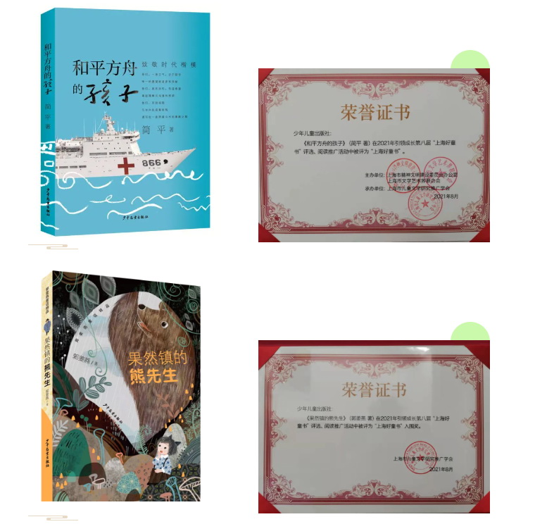 2021年10月18日下午,第八届“上海好童书”颁奖典礼在上海市文联三楼多功能厅隆重举行,上海市作家协会党组书记王伟、上海市文联专职副主席沈文忠、上海市儿童文学研究推广学会会长张锦江、少年儿童出版社总编辑陆小新等出席了颁奖典礼。少儿社的《和平方舟的孩子》和《果然镇的熊先生》在全国53家出版社推荐的232种图书中脱颖而出,分别荣获第八届“上海好童书”奖和入围奖! “上海好童书”的评选由上海市精神文明建设委员会办公室、上海市文学艺术界联合会联合主办,上海市儿童文学研究推广学会承办,旨在为孩子和家长提供一份具有公益性和公信力的好书榜单,并在评选、推荐好书的同时,引导孩子亲近阅读、培养良好阅读习惯。创办八年来,“上海好童书”已经成为上海全民读书活动的一个重要品牌,获得了越来越大的公信力与影响力。 会上,少年儿童出版社总编辑陆小新作为出版社代表进行了发言,他先是总结了传媒行业以及出版业的发展规律,在此基础上积极展望未来,认为只有能经得起推敲、受读者喜爱的好作品,才能带给孩子们真正的阅读享受,才能流传下来。而上海好童书,正给了作家、出版社这样一个良好的平台。同时,他也感谢了“上海好童书”把奖项授予少年儿童出版社出版的图书《和平方舟的孩子》。本书颁奖词中写道:“这是一本讴歌正气、书写忠于职守、救死扶伤的英雄们的作品,是一本致敬时代楷模的优秀纪实儿童文学”。《和平方舟的孩子》简平 著少年儿童出版社 《和平方舟的孩子》由著名作家简平老师创作,被列为2020年上海市重大文艺创作项目,是国内首部书写时代楷模海军“和平方舟”号医院船的长篇儿童文学纪实作品。该书以真挚饱满有力的笔触记述了“和平方舟”号赴海外进行人道主义救援,医院船上的军医精心救治国外孩子,下了船后又开赴武汉抗疫第一线的动人故事。 在书中,孩子们可以读到在茫茫大海上,医院船突遇断电,官兵们分秒必争进行抢修的惊险场面;可以读到军医们临危受命,在剧烈摇晃的船上为外国小病人完成超精密脊椎手术的现场沉浸描写;可以读到一位从埃博拉肆虐的塞拉利昂救援归来,又作为中国人民解放军医疗队队员,顾不上家里的两个幼童,奔赴收治新冠肺炎重症患者的湖北省妇幼保健院光谷院区的军医母亲的感人故事。 这部纪实文学不仅写了在医院船上的官兵们,还写了他们的小时候,写了他们自己的孩子;不仅塑造了从小就有理想,长大后报效祖国的有血有肉的英雄群像,还把笔触伸向了英雄身后的理解、支持他们的家里的孩子,内容丰富,叙述细腻,环环相扣,动人心弦;而且,书中还有海军舰船的知识和海洋地理知识,生动有趣可感。 作者简介 简平,本名胡建平,中国作家协会会员,中国文艺评论家协会会员,中国电影家协会会员,中国电视艺术家协会会员。现为上海市作家协会理事,上海市文艺评论家协会理事。供职于上海广播电视台,新闻记者,高级编辑,影视剧制片人。文学,影视,新闻作品获有多种国内外奖项。“上海市德艺双馨文艺工作者”称号获得者。《果然镇的熊先生》郭姜艳 著2020年12月 作为郭姜燕历经两年,精心创作的又一部童话精品,在《果然镇的熊先生》这部作品里,作者设置了一个比布罗镇更奇幻有趣的小镇。 刚刚进入这个小镇,你会以为这里住着一群普通平凡、甚至各有古怪的人。小小的果然镇里,有一位高大的熊先生,他性格孤僻,不喜欢孩子。而天生一对猫耳朵的“小耳朵”,跟着爷爷一起搬到了果然镇,认识的第一个人就是熊先生。古怪的大熊居然觉得自己有点儿喜欢这个长着猫耳朵的孩子。 小耳朵在镇子里又喜又忧地生活着,而镇子里的秘密也一点点被揭开。原来,这个小镇的居民,都是一些为了躲避人类伤害,幻化成人形的动物。熊先生之所以古怪,是因为失去了挚爱的妻子,伤心过度。在人类世界备受排挤的小耳朵,在将熊先生带出忧伤的同时,也在果然镇收获了珍贵的友谊。 一年一度的忘忧节来了,每个果然镇的居民都开怀畅饮,他们被幸福的生活陶醉了…… 作者简介 郭姜燕,江苏如皋人,江苏省语文特级教师,中国作家协会会员。出版有《布罗镇的邮递员》《太阳村的孩子》《季悠然和她的猫》《一把密码锁》《鼠妈妈的怪孩子》等多部小说、童话。作品曾获第十四届精神文明建设“五个一工程奖”、中宣部“优秀儿童文学出版工程”、中国好书、第十届全国优秀儿童文学奖等大奖,同时并且输出多国海外版权,并入选德国向青少年推荐“白乌鸦”书目。
