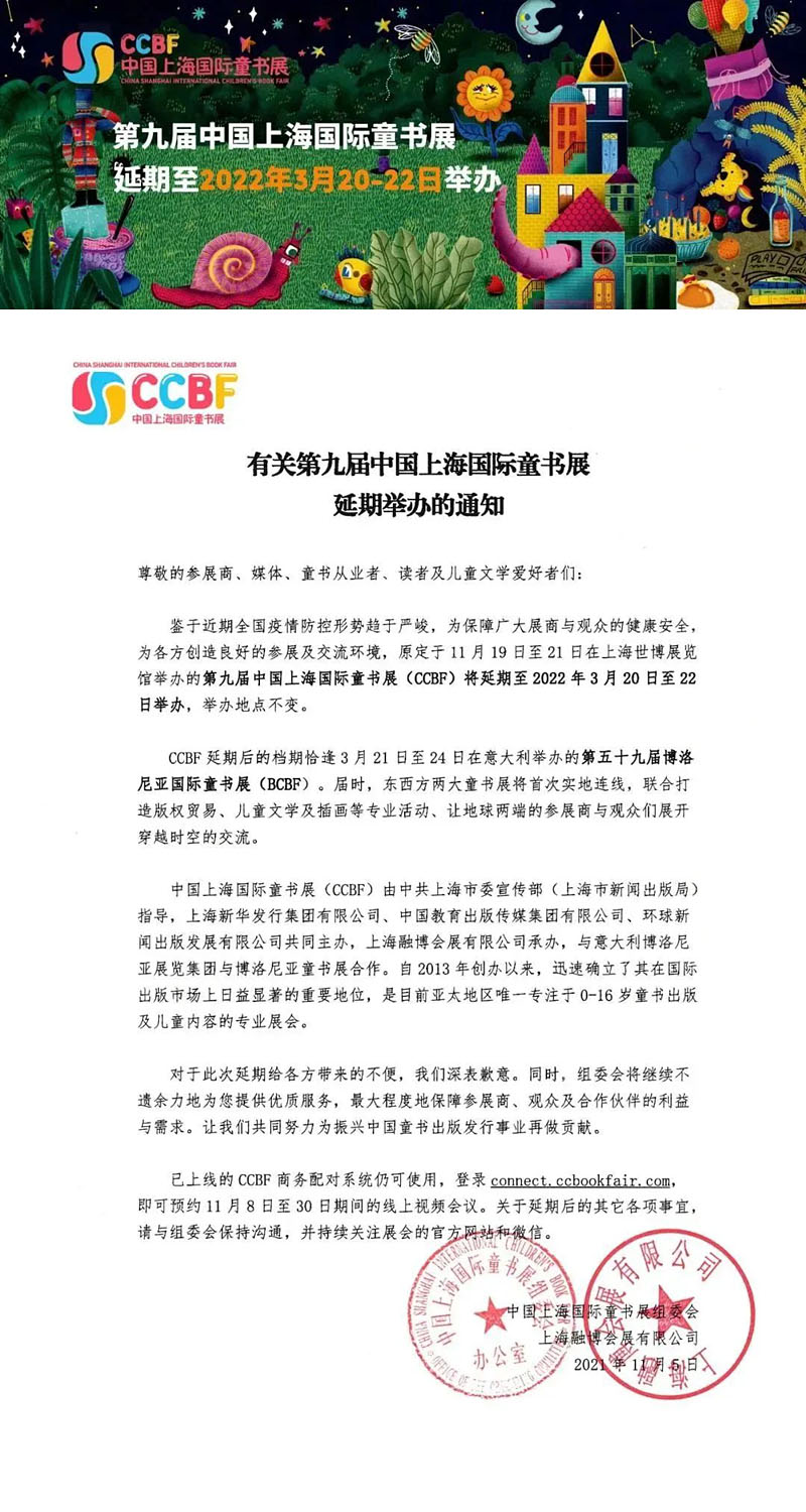 鉴于近期全国疫情防控形势趋于严峻,为保障广大展商与观众的健康安全,为各方创造良好的参展及交流环境,原定于11月19日至21日在上海世博展览馆举办的第九届中国上海国际童书展(CCBF)将延期至2022年3月20日至22日举办,举办地点不变。