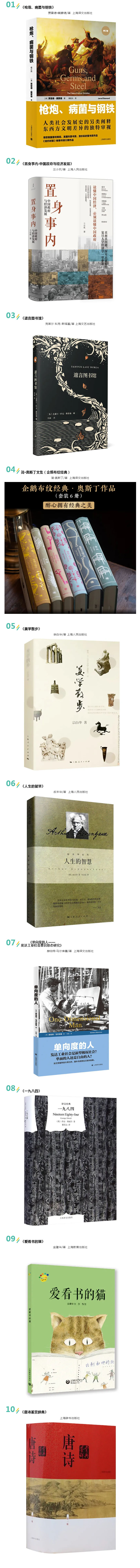 2021年11月10日,上海世纪出版集团金秋线上书展正式开启。线上书展首日,主会场上海世纪出版官方旗舰店(天猫店)为广大读者带来了集团优秀好书和好价优惠,首日销售即创新高,达到139.47万元。同时,世纪天猫还登上了天猫图书双11成交排行榜“超强爆发店铺TOP10”榜单。 文学、社科、教育、童书……世纪好书涉及类目丰富,这次线上书展,销售最好的是哪些呢?我们列出销售前十的榜单,同时将这些好书推荐给大家。销售TOP10 01 《枪炮、病菌与钢铁》 贾雷德·戴蒙德/著 上海译文出版社 为什么是欧亚大陆人征服、赶走或大批杀死印第安人、澳大利亚人和非洲人,而不是相反?为什么小麦和玉米、牛和猪以及现代世界的其他一些“了不起的”作物和牲畜出现在这些特定地区,而不是其他地区?在这部开创性的著作中,演化生物学家贾雷德·戴蒙德揭示了事实上有助于形成历史最广泛模式的环境因素,从而以震撼人心的力量摧毁了以种族主义为基础的人类史理论,因其突出价值和重要性,本书荣获1998年美国普利策奖和英国科普书奖,并为《纽约时报》畅销书排行榜作品。 02 《置身事内:中国政府与经济发展》 兰小欢/著 上海人民出版社 《置身事内:中国政府与经济发展》是复旦大学经济学院副教授兰小欢多年教学与研究内容的凝练,将经济学原理与中国经济发展的实践有机融合,以地方政府投融资为主线,深入浅出地论述了中国经济的发展,笔触简练客观,并广泛采纳了各领域学者的研究成果。全书以我国地方政府投融资为主线,分上下两篇。上篇解释微观机制,包括地方政府的基本事务、收支、土地融资和开发、投资和债务等;下篇解释这些微观行为与宏观现象的联系,包括城市化和工业化、房价、地区差异、债务风险、国内经济结构失衡、国际贸易冲突等。最后一章提炼和总结全书内容。 03 《遗言图书馆》 克莱尔 科克-斯塔基/著 上海文艺出版社 临终遗言,可算是最精彩的超短篇了。 它们出自最接近死亡之人。逝者与生者的声音在这寥寥数语中交汇,让人得以一窥死亡之于生命的分量。 04 简·奥斯丁文集(企鹅布纹经典) 简·奥斯丁/著 上海译文出版社 《简·奥斯丁文集》由企鹅图书授权,上海译文出版社联合出品,是一套高度还原享誉国际书界的“企鹅布纹经典”形神之美的经典外国文学名著。书壳按企鹅原版相同装帧工艺标准制作,原料定制,原件制版,大面积高难度烫印工艺,具有极强的辨识度,凸显古雅经典又不失现代的高级质感。译文采用包括王科一等在内的、在几代中国读者心目中有口皆碑的卓越名家译本。本丛书包括《爱玛》《傲慢与偏见》《理智与情感》《劝导》《诺桑觉寺》《曼斯菲尔德庄园》,都是简·奥斯丁的传世名作。 05 《美学散步》 宗白华/著 上海人民出版社 宗白华先生一生著述不多,而《美学散步》则几乎汇集了其最精要的美学篇章,是先生的代表作,也是他的一部美学著作。全书文辞典雅,富于诗情画意,将中华传统文化的独特魅力娓娓道来,让收藏在禁宫里的文物、陈列在广阔大地上的遗产、书写在古籍里的文字都鲜活起来,让每一位为俗务所纷扰的现代读者,每一个渴望自由宁静的现代心灵,都能在先生灵动的文字里,充分感受人间的诗意和对生命的憧憬。 06 《人生的智慧》 叔本华/著 上海人民出版社 叔本华于1850年写了《附录和补遗》一书,《人生的智慧》是该书中的一部分。在书中,他以优雅的文体,格言式的笔触阐述了自己对人生的看法。《人生的智慧》使沉寂多年的叔本华在晚年一举成名。这本书讨论的事情与我们的世俗生活至为接近,诸如健康、财富、名声、荣誉、养生和待人接物所应遵守的原则等。正如叔本华所说的,在这本书里他尽量以世俗、实用的角度考虑问题。因此,这本书尤其适合大众阅读。 07 《单向度的人——发达工业社会意识形态研究》 赫伯特·马尔库塞/著 上海译文出版社 《单向度的人:发达工业社会意识形态研究》除导言外包括“单向度社会”“单向度的思想”和“进行替代性选择的机会”三部分。作者通过对政治、生活、思想、文化、语言等领域的分析、批判,指出发达工业社会是如何成功地压制了人们内心中的否定性、批判性等,使这个社会成为单向度的社会,而生活于其中的人成了单向度的人,这种人丧失了自由和创造力,不再想像或追求与现实生活不同的另一种生活。