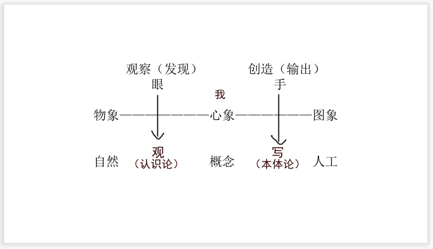 为了说明的方便,我们常将艺术的表达分为“观”与“写”两个阶段。所谓“出乎其外,故能观之,入乎其内,故能写之”,“观”与“写”,一则应目会心,一则自心付手。前者主感知,属认识论,后者主工具,属本体论。认识论与本体论共同形构了绘画实践的全部内容。拥有敏锐的艺术感受而没有合适的工具传达则人文无以彰显,掌握熟练的工具表手段却没有敏锐的艺术感受则实践主体势必被工具异化,成为“虚假的表达”。自然之物经眼和手的双重变形落实为人造之物,在这中间起桥梁作用的始终是作为自我象征的实践主体的“心”。中国人称绘画是“心印”,其美学依据亦正在于此。