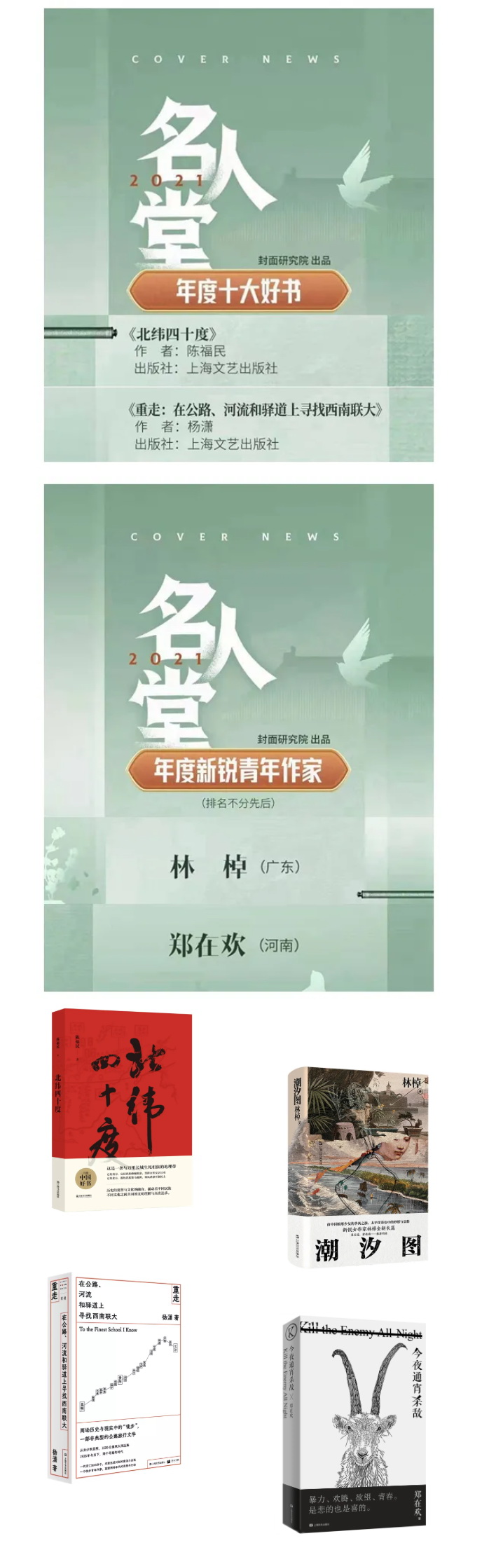 2021年名人堂·年度人文榜揭晓,上海文艺出版社《北纬四十度》《重走》入选年度十大好书,林棹(《潮汐图》)、郑在欢(《今夜通宵杀敌》)入选年度青年作家。