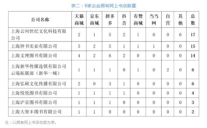 8企业拥有400余家实体书店、67家网上书店 参与调研的8家企业开设网上书店67家,见表二。除了上海新华传媒连锁有限公司云端拓展部(新华一城)拥有两家自营网店,其他7家企业主要借助第三方平台进行网上书店经营,被利用频率较高的第三方平台有拼多多、天猫商城、京东商场、抖音、有赞商场、当当网。上海新华传媒连锁有限公司云端拓展部(新华一城)除了天猫、京东、拼多多、有赞各有一家网上书店外,还自营新华一城书集(www.bookmall.com.cn)、新华书店网上商城(www.xhsd.com)。