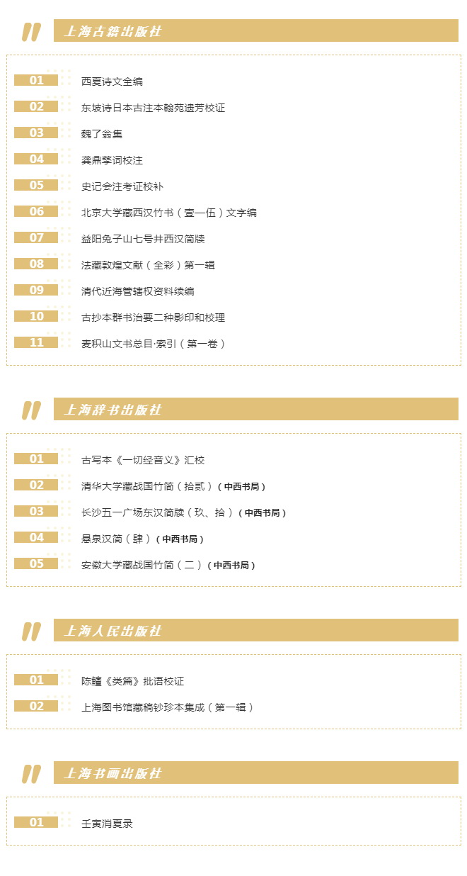 根据国家古籍整理出版资助项目管理工作有关规定,全国古籍整理出版规划领导小组办公室近日将2022年度国家古籍整理出版拟资助项目名单予以公示,共77个项目入选。其中,上海世纪出版集团19个项目入选:上海古籍出版社11个,上海辞书出版社5个(中西书局4个),上海人民出版社2个,以及上海书画出版社1个。相较去年,在总项目数减少10个的情况下,集团入选项目数增加3个。