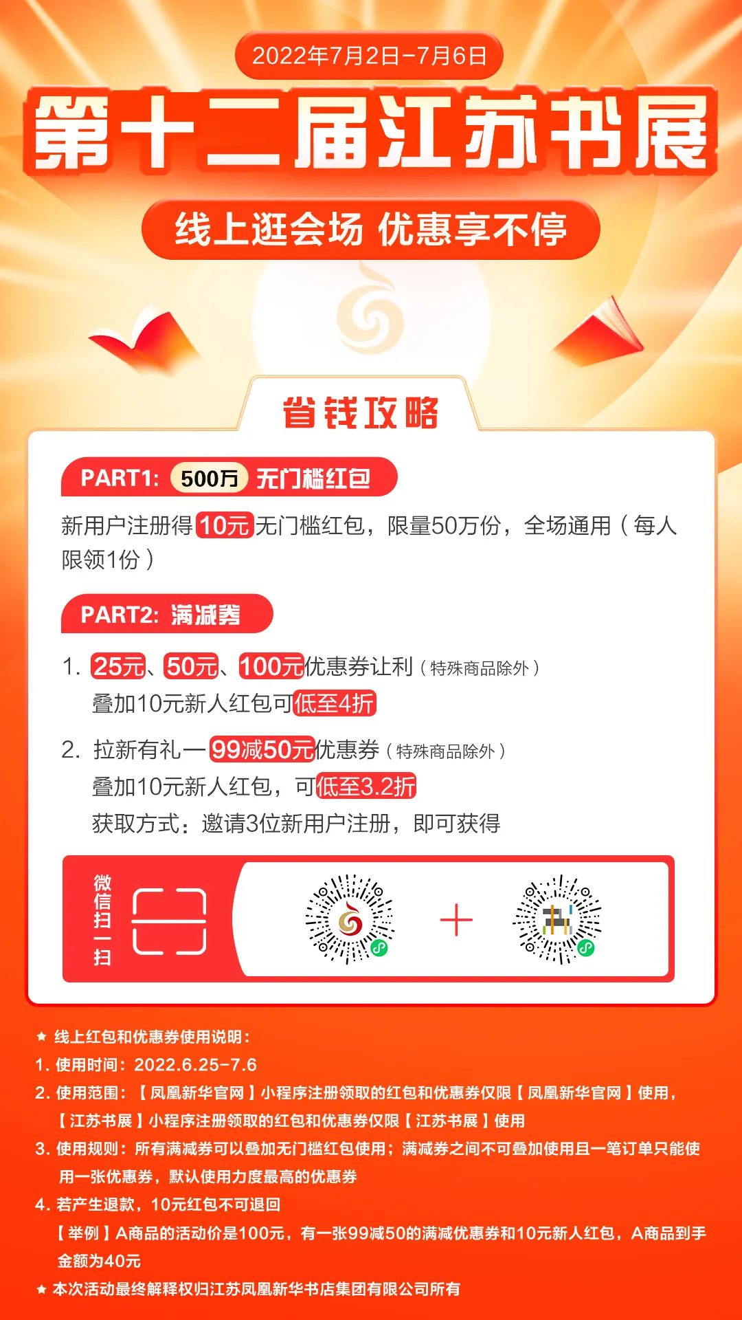 凤凰新华书店集团在凤凰新华官网、江苏书展APP同步举办“云书展”,“云书展”将于6月25日提前开展!书展期间除特殊品类外,图书全场8折、线上线下同价。同时通过在这两个官方线上平台以及淘宝、京东等第三方流量平台发放购书现金红包、优惠券等,给广大读者带来实际优惠。