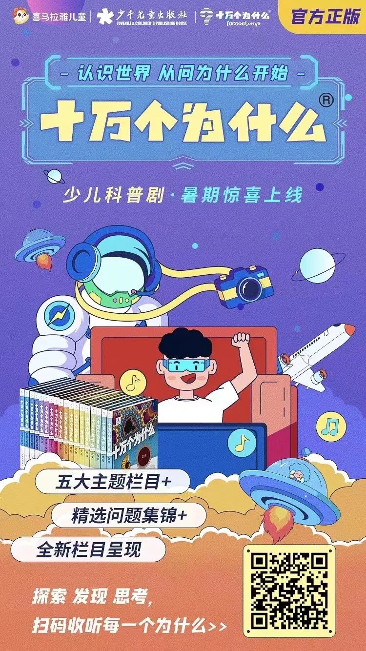 少年儿童出版社联合喜马拉雅儿童出品首档少儿科普剧《十万个为什么》。双方强强合作,以音频广播剧形式推出经典科普IP,并通过喜马拉雅AI技术推出AI讲读版。暑期来临前,《十万个为什么》少儿科普剧现已上线喜马拉雅及喜马拉雅儿童App,将陪伴青少年徜徉在知识的海洋。