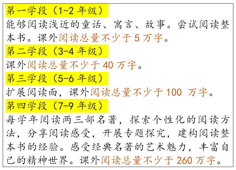 随着语文学科以20%—22%的比例成为各科目中总课时占比最高的学科,“得语文者得天下”的说法在许多家长之间盛传。仔细研究过2022年版新课标后就会发现,阅读已然成为语文学习中至关重要的关键点。且不论新版课标中专门增加了对于“整本书阅读”的详细说明和要求,单看“学段要求”这一部分,就可窥得一二: