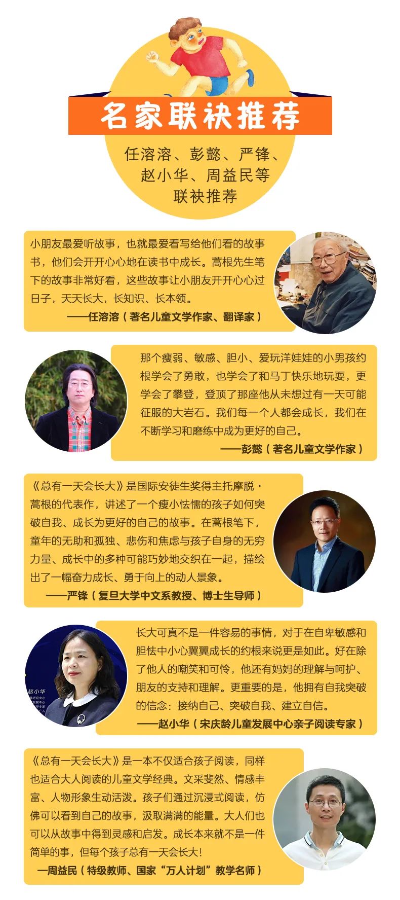 复旦大学中文系博士生导师严锋教授指出:“《总有一天会长大》是国际安徒生奖得主托摩脱·蒿根的代表作,讲述了一个瘦小怯懦的孩子如何突破自我、成长为更好的自己的故事。在蒿根笔下,童年的无助和孤独、悲伤和焦虑与孩子自身的无穷力量、成长中的多种可能巧妙地交织在一起,描绘出了一幅奋力成长、勇于向上的动人景象。”