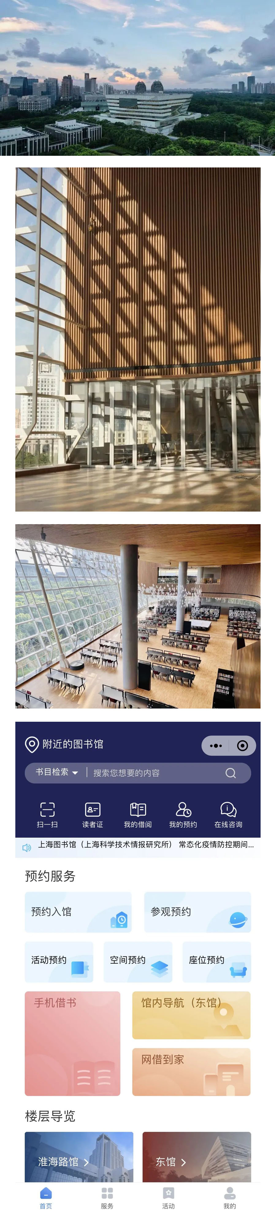 公测期间,读者即可体验这套全新的线上预约系统。打开系统,预约入馆即一般入馆,参观导览和活动都可单独预约,选择三楼阅读广场南区座位的读者可以进行“座位预约”。