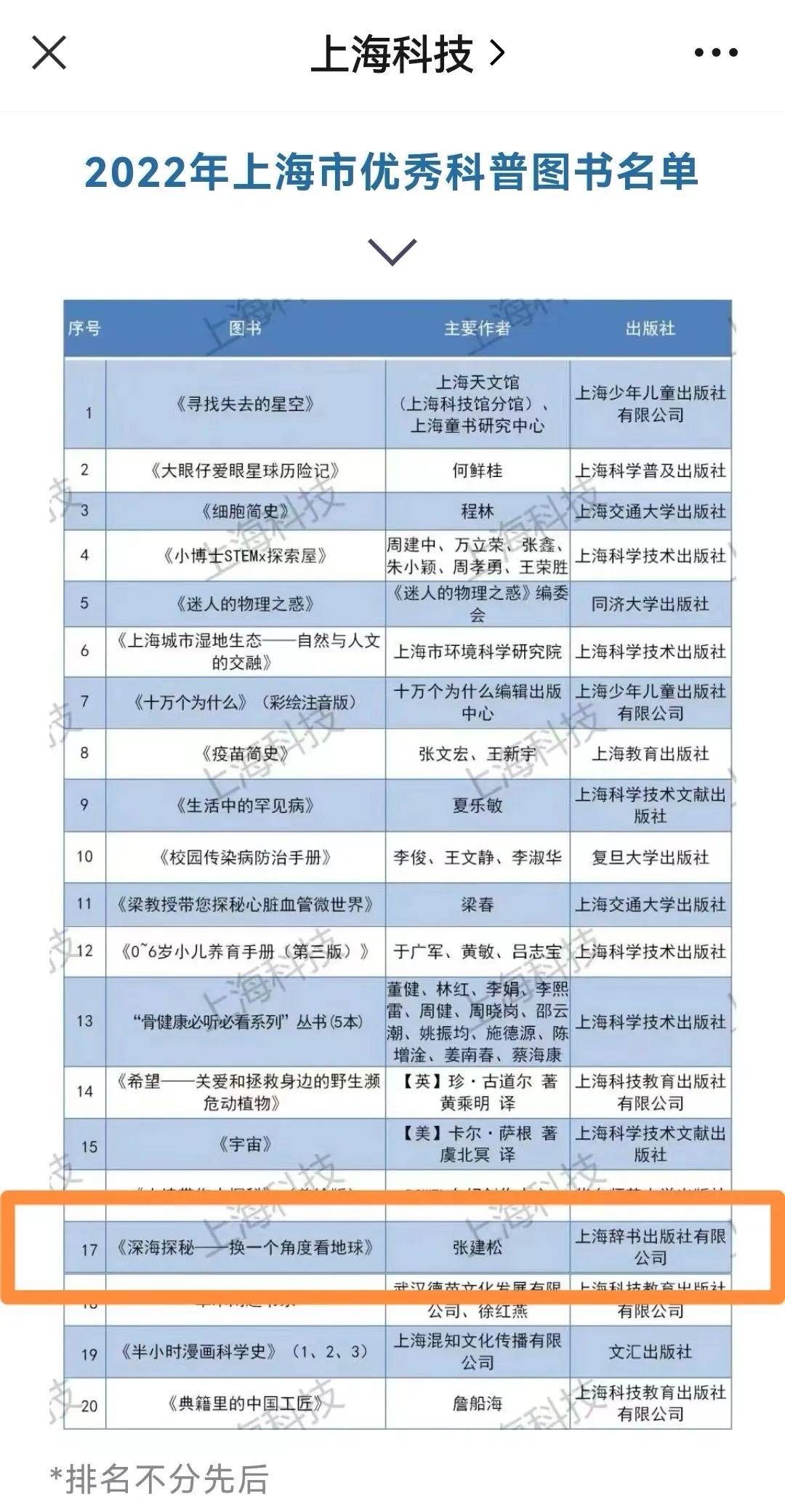 为期一周以“走进科技,你我同行”为主题的2022上海科技节于8月26日下午精彩收官。在宝山智慧湾上海科普公园举行的2022上海科技节闭幕式暨颁奖仪式上,现场揭晓了上海市优秀科普作品奖的获奖名单。上海辞书出版社《深海探秘——换一个角度看地球》榜上有名。作为获奖出版社代表,该书责任编辑朱志凌受邀前往上海科技节活动现场登台领奖。
