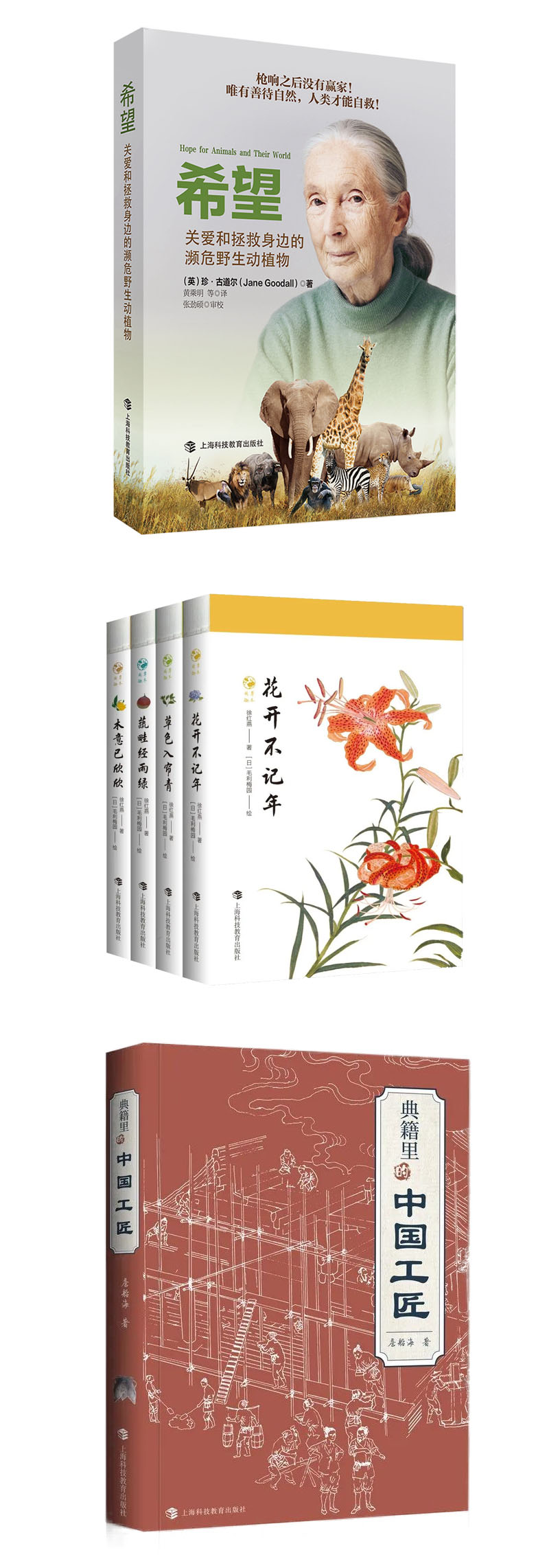 上海科技教育出版社(3种) 《希望——关爱和拯救身边的濒危野生动植物》 [英]珍·古道尔 著 黄乘明 等 译 张劲硕 审校 当动植物从一片片大陆上消失、我们每天都被环境恶化的坏消息所包围时,珍·古道尔博士的这本书给我们带来关于动植物王国未来的新希望:通过人们的努力,一些曾经濒危的物种,现在数量在不断回升!本书讲述的希望故事包括: ● 超轻型飞机充当“父母”,教会美洲鹤沿着一条新的迁徙路线飞行。 ● 为了帮助加州神鹫“准父母”孵出健康的雏鸟,工作人员偷走鸟巢中的蛋,然后在巢中放入一个模型蛋。 ● 为了让游隼对人工繁殖作出更多贡献,生物学家头戴“交配帽”,每天耐心地等待着游隼的“宠幸”。 ● 为了帮助恢复稀有的泽氏金蟾,人们设立了专门的宾馆——“蛙类希尔顿”。 ● 矛尾鱼,一种高度特异的巨大鱼类,在被认为已灭绝了6500万年后,被重新发现。 …… 50多个保护濒危野生动植物的故事,古道尔博士娓娓道来…… “草木闲趣书系” 徐红燕 著 [日]毛利梅园 绘 本书系以富有文学性的笔法品读身边的植物,既有科学知识介绍,又有历史文化解读,内容精辟、语言平实、文笔生动,是博物学与传统文化的结合。书中图片为日本江户时期博物学家毛利梅园的作品。其画作为实地采写,具有高度的科学性;绘画精美,富有东方审美意趣;物种丰富,贴合本土生态环境。本书采用特种纸全彩印刷,裸脊锁线装,兼具阅读价值与收藏价值。 《典籍里的中国工匠》 詹船海 著 中国有着悠久且无间断的五千年文明,蕴藏着无限的创造力。中国传统文化典籍中,记录了许多中国制造和中华工匠的故事。本书对中华传统文化典籍中蕴涵的科技文明进行了系统梳理,对典籍中的各种发明记录和工匠传说,逐一追根溯源、机趣解读,还原成一个个鲜活生动、意趣盎然的科普故事,让读者在活色生香的古典文化氛围中,品味并享受到五千年中华科技文明的自豪和骄傲,并通过劳动叙事,传播中国传统的科技文明和创新成果,体现对工匠精神的传承。少年儿童出版社(2种) 《寻找失去的星空》 上海天文馆(上海科技馆分馆) 上海童书研究中心 编 小百灵和猫咪大宝住在灯火辉煌的城市里。爱画画的小百灵打算画一幅城市夜景参加比赛,但一颗从天而降的星星却改变了她的想法。小百灵和大宝跟着星星离开城市,来到郊外的山上,看到漫天的星光。这时小百灵才发现,城市的灯光像罩子一样,隔开了星星伙伴和城市里的人们。小百灵希望大家都能重新见到满天的星星,于是她做了一个特殊的小灯笼,开始“回收利用”多余的灯光。越来越多的人加入到小百灵的行动中。当城市的夜空渐渐暗了下来,星星伙伴悄悄地出现了。除夕夜,随着新年倒计时的钟声,城市的灯光全都熄灭了,黑暗的夜空上演了一场星星伙伴们带来的“新年烟花秀”。 《十万个为什么》(彩绘注音版) 十万个为什么编辑出版中心 编著 这是一套给小学中低年级孩子的科普书,由60年经典品牌“十万个为什么”正版出品,在经典的《十万个为什么·第六版》基础上,结合问卷收集到的孩子爱问的500多个高频科学问题全新打造。全套书共8册,包含孩子经常接触的宇宙、地球、恐龙、动物、植物、人体、脑科学、生活常识等,用通俗易懂的问答方式讲科学,每个问答还设计了拓展知识小版块,书中文字排版采用小学语文标准的大字注音设计,适合小学中低年级孩子自主阅读。上海教育出版社(1种) 《疫苗简史》 张文宏 王新宇 主编 本书系复旦大学附属华山医院感染科主任张文宏教授领衔编写的科普作品,与《病菌简史》(典藏版)为姊妹篇。通过介绍疫苗的发现史、发展历程及未来趋势,将十余种疫苗研发的故事娓娓道来,既科学严谨又引人入胜,旨在帮助广大读者正确认识疫苗接种,了解疫苗的工作原理,消除不必要的顾虑,倡导科学精神,增强对科学的信任感。典藏版开本小巧便携,装帧典雅精致,图文编校全面优化升级,宜读、宜赏,更宜藏。