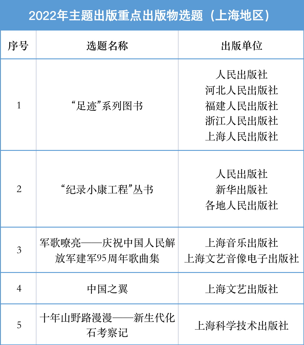 今年,各地区各部门各出版单位精心组织报送主题出版选题2240种。经评选论证,最终确定主题出版重点出版物选题160种,其中图书选题140种、音像电子出版物选题20种。上海地区各出版社共5种选题入选。