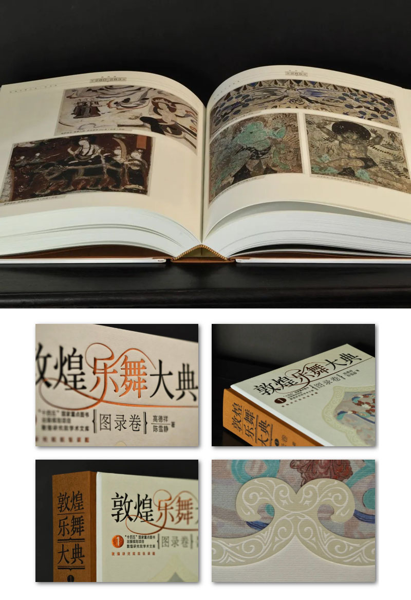值得一提的是,《敦煌乐舞大典》邀约全国顶尖的装帧设计大师袁银昌为这部巨作担任整体装帧设计。图书采用六种烫色,经多次测试,每道工序皆手工精心打造,典藏级别高规格材质结合印刷、烫压、激凸等特殊工艺,书脊一边采用斜切面,细小坡度和微妙弧度提升了图书整体品质。