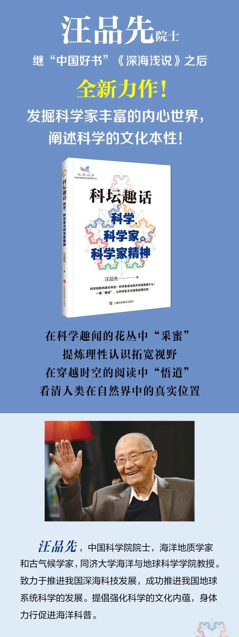 在“中国好书”《深海浅说》出版两年后,86岁的中国科学院院士、同济大学教授汪品先在今年上海书展推出最新作品《科坛趣话——科学、科学家与科学家精神》。