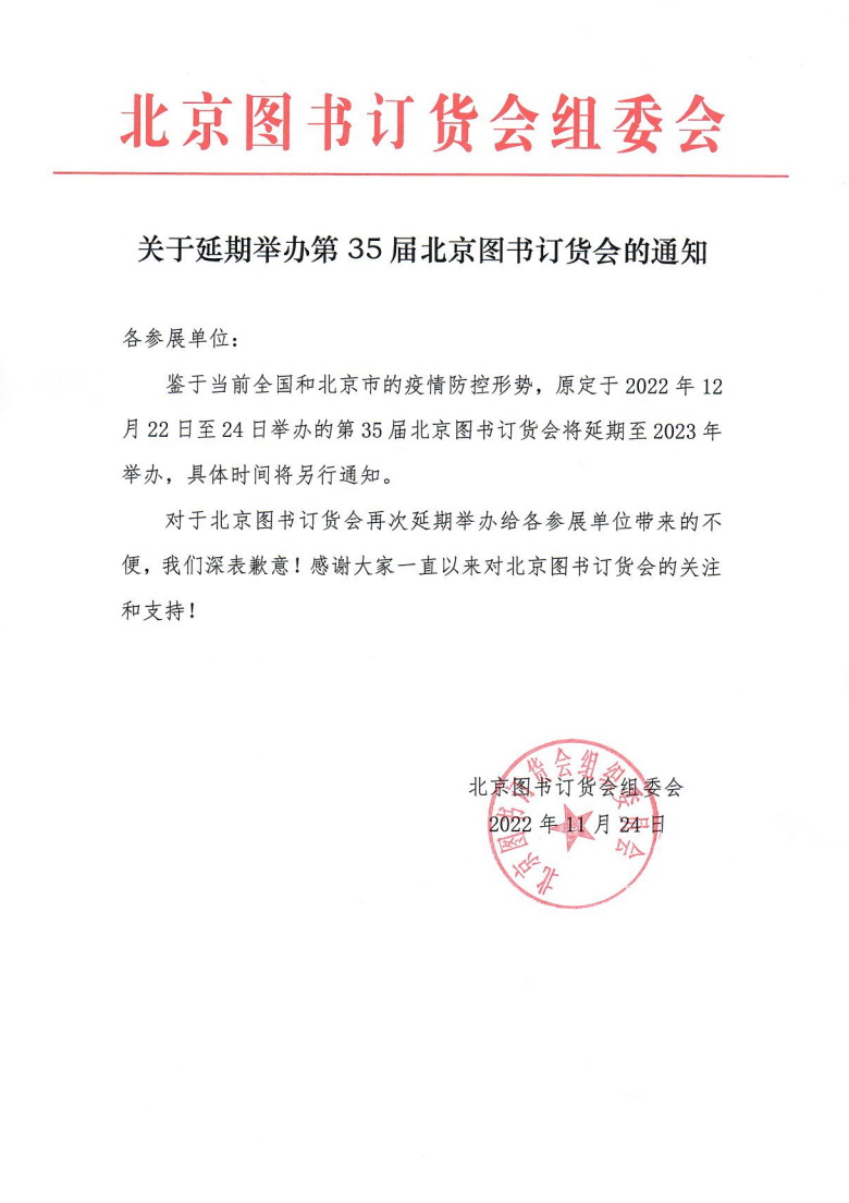 原定于2022年12月22日至24日举办的第35届北京图书订货会将延期至2023年举办,具体时间将另行通知。