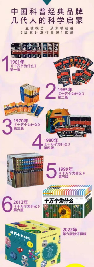 《十万个为什么》是少年儿童出版社于1961年出版的一套青少年科普读物。在半个多世纪的岁月里,这套书先后出版了6个版本,累计发行量超1亿册,引导着千千万万的青少年走上了科学探索的道路。在我国,至今还没有一套科普读物能像《十万个为什么》那样经得起如此长时间的检验,并产生如此巨大的社会影响。