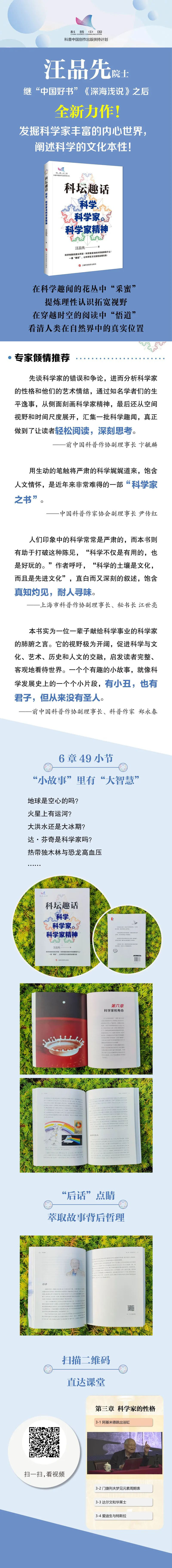 在介绍《科坛趣话——科学、科学家与科学家精神》这本书的创作渊源时,汪院士说:“写这本书的缘起,是我在同济大学开设的一门通识课:科学与文化。目的是通过讲故事,从科学的文化源头出发,阐发科学的创新本质。希望有助于纠正对科学的误会,(大家)不要把科学看得太严肃。”