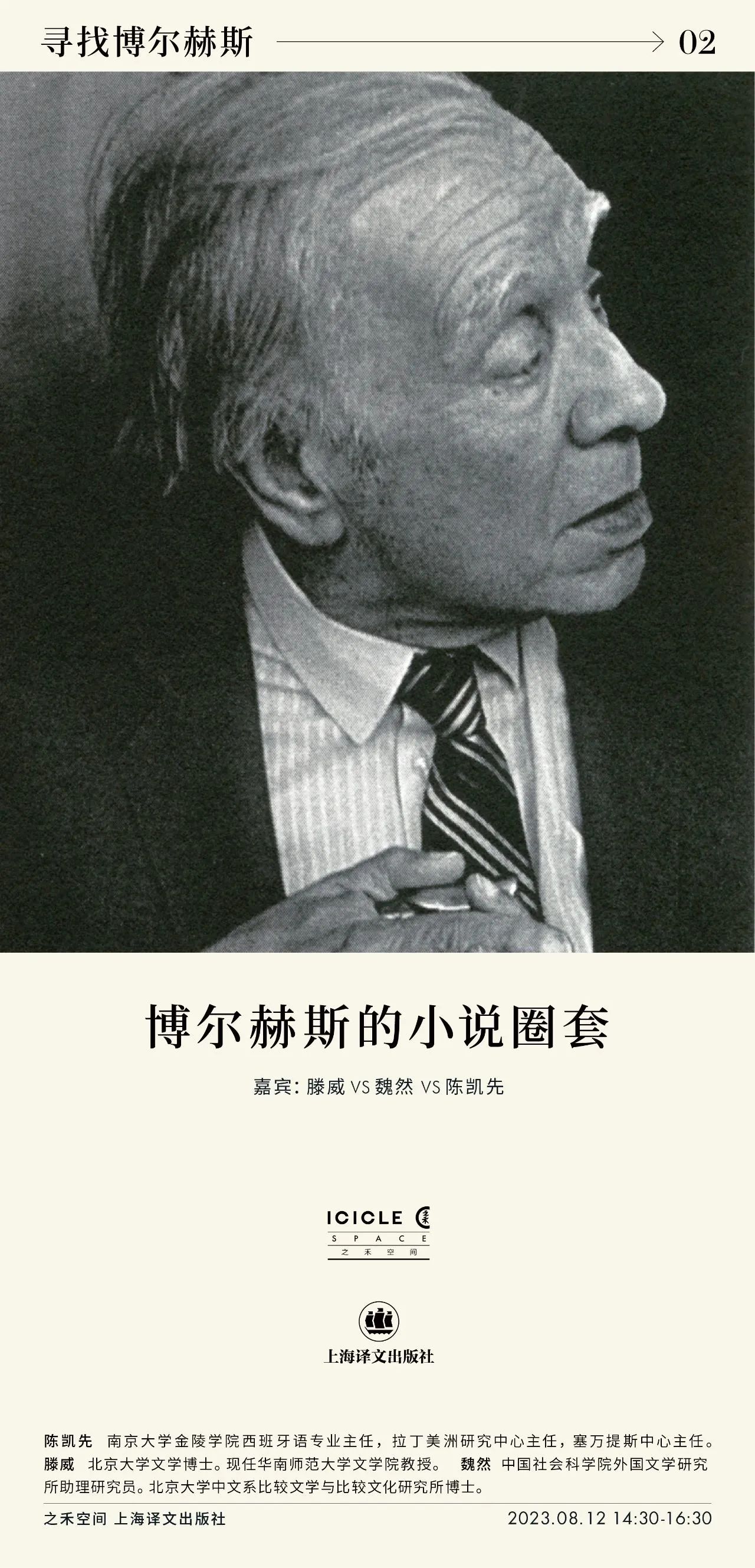 寻找博尔赫斯主题活动 第二场博尔赫斯如何到中国?——博尔赫斯的译介与接受活动嘉宾陈凯先滕威魏然活动日期2023年08月12日 14:30—16:30活动地点ICICLE SPACE 之禾空间合川路2570号科技绿洲三期二号楼1-2F博尔赫斯如何到中国?——博尔赫斯的译介与接受 王永年大概是最早引介、译介博尔赫斯的中国翻译家。早在一九八一年《世界文学》第六期上就发表了他首译的“博尔赫斯小辑”。自此也掀起了中国的“博尔赫斯热”,对一代中国作家和读者都产生了深远影响。其中包括余华、格非、马原、残雪等,如今驰名国内外的小说家。 如何看待,博尔赫斯这样一个有着英国血统的阿根廷人,对中国自上世纪八十年代以降的文化影响?这一影响有什么历史动机?又是否对当下的中国读者依然有效? 2023年8月12日下午,主题活动的第二场将在 ICICLE SPACE 之禾空间 正式开讲。带着上述的问题,我们邀请了国内西班牙研究的学者、专家,一起聊聊,探讨博尔赫斯与他在中国的“奇妙旅程”。活动嘉宾 陈凯先 南京大学金陵学院西班牙语专业主任,拉丁美洲研究中心主任,塞万提斯中心主任,中国外国文学学会理事,江苏省译协理事,享受国务院政府特殊津贴。2004年获得西班牙国王和政府颁发的“文化成就骑士勋章”。 滕 威 北京大学文学博士,华南师范大学文学院教授,华南师范大学微文化研究中心主任。2013-2014年度哈佛-燕京访问学者,2023年春季中山大学人文高等研究院特邀青年访问学者。主要研究领域为文化研究、翻译研究、西班牙语文学与文化等,代表作有《边境之南:拉丁美洲文学汉译与中国当代文学》 魏 然 本科毕业于北京大学西班牙语系,博士毕业于北京大学中文系比较文学与比较文化研究所,获文学博士。供职于中国社会科学院外国文学研究所。从事西班牙语文学、拉丁美洲文化与思想史研究。曾先后在委内瑞拉安第斯大学(2007年)、德国古腾堡大学(2008年)担任访问讲师。2010-11年在美国杜克大学罗曼语言文学系从事访问研究一年。2016年通过中国社科院海外高端智库交流平台,赴布宜诺斯艾利斯拉丁美洲社会科学理事会从事访问研究。联合主办上海译文出版社「寻找博尔赫斯」翻译手稿展览&主题活动 翻译手稿展览: 时间:2023.08.01 — 2023.09.9 10:00 — 20:00 地点:ICICLE SPACE 之禾空间 2F 主题活动安排: 8.4 第一场 博尔赫斯中文作品出版四十年漫谈 活动嘉宾:梁永安 8.12 第二场 博尔赫斯的小说圈套 活动嘉宾:陈凯先 滕威 魏然 8.19 第三场 博尔赫斯与祖国&博尔赫斯与中国 活动嘉宾:张伟劼 8.26 第四场 博尔赫斯诗歌音乐会 活动嘉宾:田艺苗、代博、陈蕾 9.2 第五场 博尔赫斯诗歌的魅力与神秘 活动嘉宾:范晔