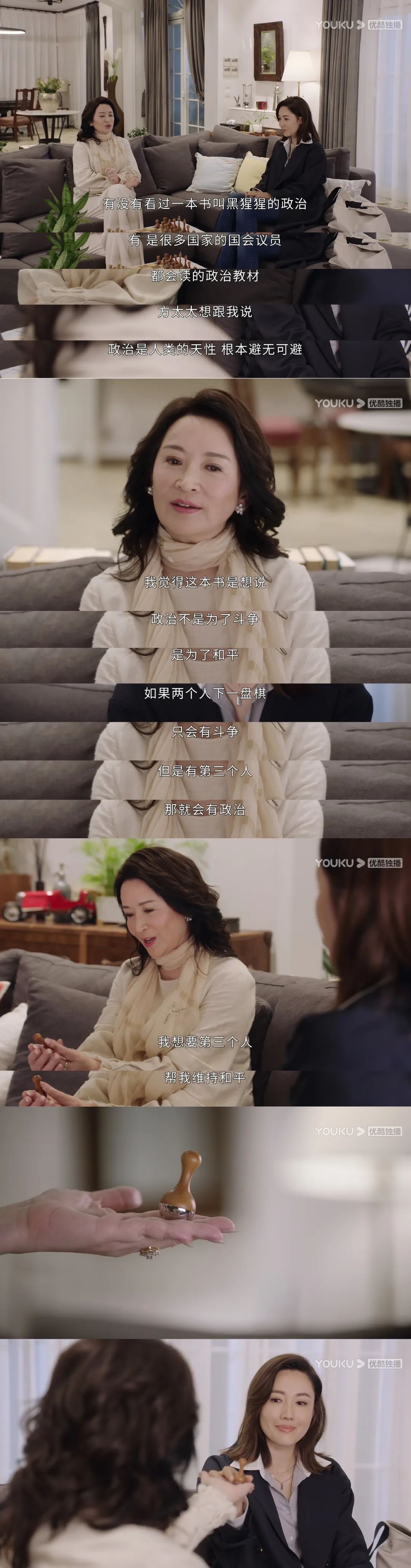 在这里,媒体高层方太(左)想要扶持张家妍(右)成为“第三方势力”,所以引用《黑猩猩的政治》来劝说张家妍。