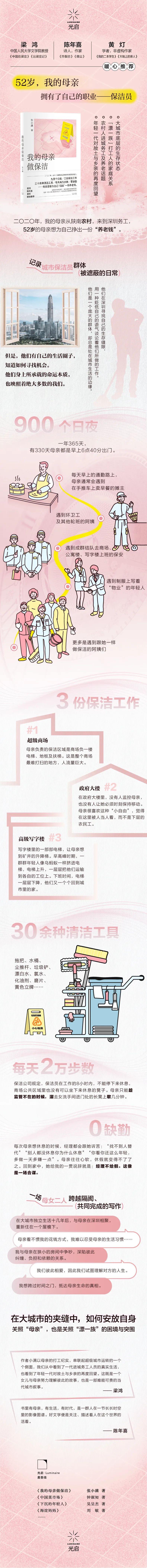 《我的母亲做保洁》是光启书局本土纪实作品系列——“晨昏线”的首部上市著作。“晨昏线”取交界与变动之义,它是晨来夜往的象征,也如同过去与今日的更替,作者们立足当下,去记录时代变迁中的人缘际遇和社会记忆。之后还有更多作品陆续出版。光启书局期待越来越多关注本土社会、专注非虚构写作的优秀青年作者的加入,也期待这批饱含情感、新锐有力的纪实作品,能为读者深刻呈现稍离主流的现代生活现场,书写出真正的人世百态。