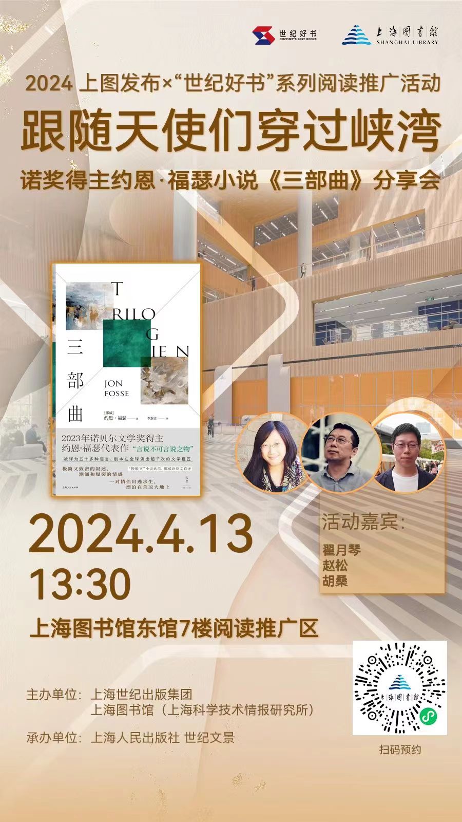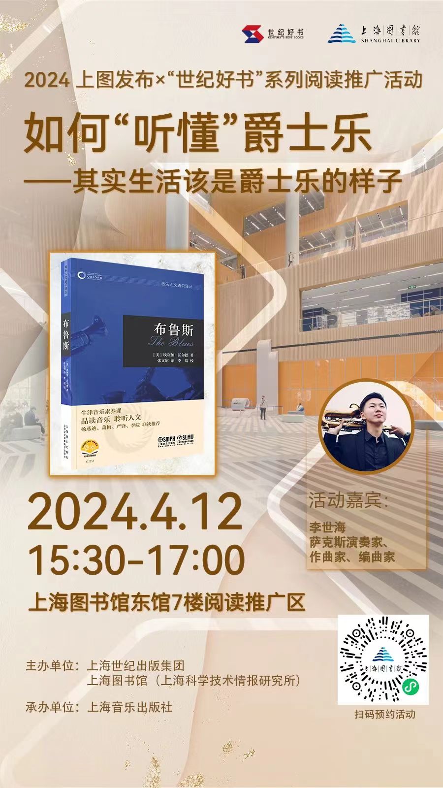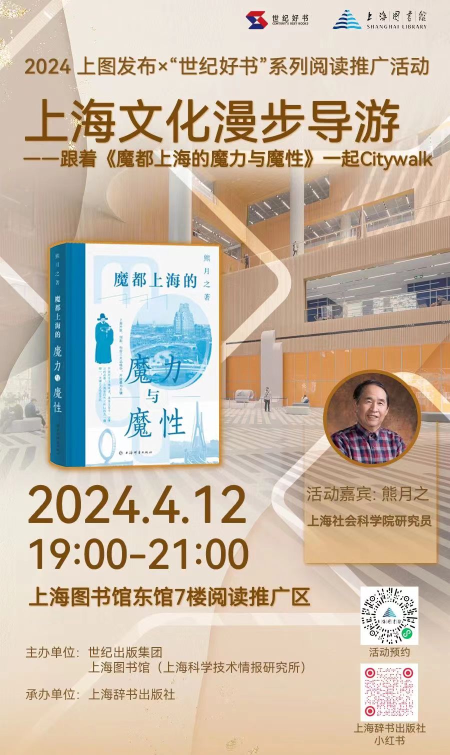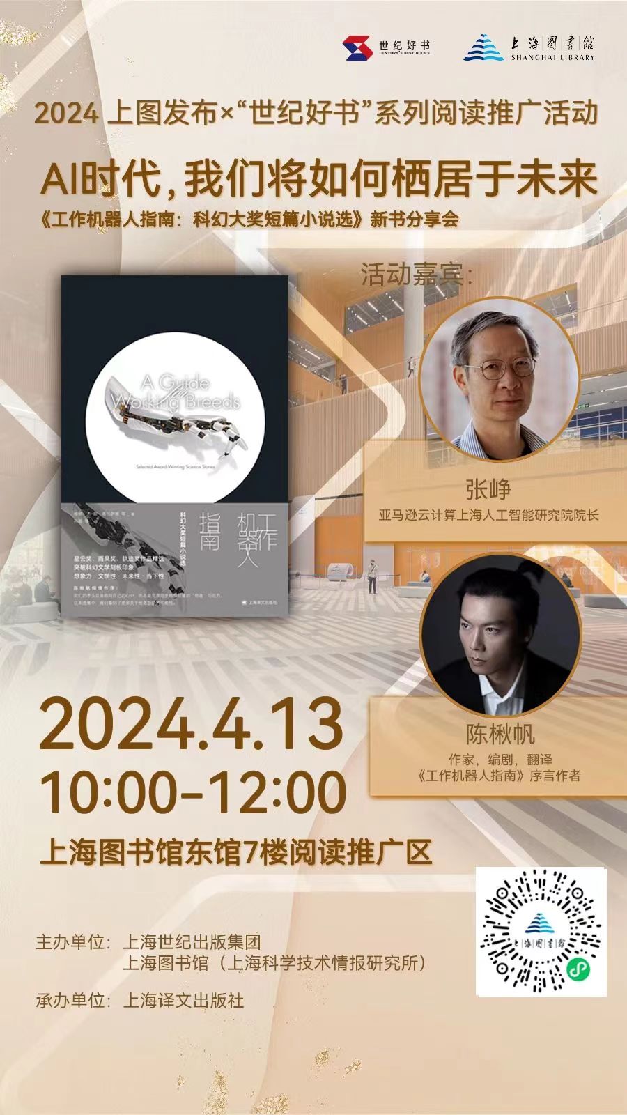 02如何“听懂”爵士乐——其实生活该是爵士乐的样子活动介绍 什么是爵士乐? 它是诺贝尔文学奖得主鲍勃·迪伦年少时期的钟爱,自爵士乐发轫之地新奥尔良出发,沿着美国61号“蓝调公路”一路向北,便是孕育摇滚诗人的故乡;它让青年时期的村上春树甘愿负债经营俱乐部,只为七年如一日,每日每夜都沉醉在爵士乐中;它让著名导演伍迪·艾伦痴迷70余年,于他而言,爵士乐如神话艺术般绮丽绚烂。 作为爵士乐的起源之一,布鲁斯音乐最早于1910年代初期席卷美国,在其后60年间持续扮演主流流行音乐的重要驱动力,并于全球范围内被广泛表演与聆听。布鲁斯曾被邻里乐队、街头吉他手与戏剧名伶演绎,如今也时常充当汽车广告和西部片的背景音乐,形式从轻柔的原声吉他旋律到嘎吱作响的布鲁斯摇滚。布鲁斯低语着、高喊着、咆哮着、呻吟着、转着音,从口琴到电子合成器,无所不能。那么,鉴于一个世纪以来不断流变的受众群体、口味和技术,任何试图理解这种音乐类型的尝试均始于这个问题,即:布鲁斯,究竟是什么? 它是“一个好人感到忧伤”,是“一种低沉而刺骨的寒意”,是“你脑海中恋人的模样”,还是“一场缓慢而疼痛的心脏病”?03上海文化漫步导游——跟着《魔都上海的魔力与魔性》一起Citywalk活动介绍 为什么说徐家汇是“海派之源”? “白相了大世界就等于白相了大上海”?上海“大世界”到底是怎么火起来的? 上海为什么会被称作“光明的摇篮”?去一大会址打卡之前需要了解些什么? 老上海人去张园都会玩些啥?和现在都有哪些区别? 春光绚烂,最适合出门荡马路。想在上海开展城市漫步的读者朋友们,不妨先来了解这座城市的历史吧,让我们在丰富的历史故事中,把握城市的文化脉络。 2024年4月12日晚上7点,上海史专家熊月之将携“世纪好书”《魔都上海的魔力与魔性》做客上图东馆7楼阅读推广区,从历史角度与读者朋友共话“魔都”往事,感受上海魅力,并为大家推荐魔都City Walk不得不去的地方。分享会上,熊月之老师还将为读者签名售书。04AI时代,我们将如何栖居于未来——《工作机器人指南:科幻大奖短篇小说选》新书分享会活动介绍 从元宇宙到ChatGpt到Sora,每一次AI技术的迭代都让人兴奋颤栗,甚至带来恐慌——智能算法正影响甚至反向控制着我们生活工作的方方面面。科幻小说的想象陆续成为现实,未来已来,我们该如何栖居于这个AI狂飙突进的时代? 这个问题似乎可以从科幻文学与科学技术两方面展开探讨。科幻文学的价值不只在于构建充满惊奇感的想象空间,还在于呈现技术、社会、人性发展的多种可能性,助力解决现实问题、厘清未来发展路径。而理解前沿技术、跟上AI脚步,则让我们更清醒地抓住机遇,做好智性上的准备迎接多元未来。 不妨从新近出版的、集中展现近5年欧美科幻创作新发展的小说集《工作机器人指南》出发。A Guide for Working Breeds,也可译成“社畜机器人指南”,暗合了今日的许多焦虑情绪。书籍同名小说里,一对痴迷狗狗、拥有深度学习能力和人类复杂感官机能的机器人,在一次次错置与撕裂中,一步步突破人类设定的框架、觉醒着自己的机器人格——有关人工智能失控的种种猜想在这篇点题之作里得到了有趣回应。这本小说集用奇谲瑰丽的想象叙事,直击当下痛点,带给我们有关现实与未来的热烈而审慎的思考。 2024年4月13日(周六)10:00,上海图书馆东馆7楼阅读推广区,特别邀请张峥和陈楸帆两位跨界先锋,就《工作机器人指南》,与大家聊聊AI成为全球技术爆点的时代,我们该做好哪些理智与情感上的准备来拥抱充满无限可能的未来。05跟随天使们穿过峡湾:诺奖得主约恩·福瑟小说《三部曲》分享会活动介绍 2023年诺贝尔文学奖得主福瑟小说《三部曲》犹如一场由峡湾、森林组成的孤寂的北欧之旅。故事中的主人公是一对失去了家园的年轻情侣,他们赤裸裸地生存在大地上,盲目而决绝地漂泊着,仿佛沉默的天使,言说着难以言说之物。福瑟的语言也一样荒凉、冷寂、独特,这是一次跨越了诗、小说和戏剧边界的写作。 《三部曲》带来了怎样的启示?福瑟作品的极简主义体现在哪些方面?剧作家创作的小说有何特点?福瑟的小说和他的戏剧之间有怎样的关联? 2024年4月13日13:30,我们邀请了戏剧学者翟月琴、作家赵松、诗人胡桑,请他们带我们探讨这些话题,一起穿越这片广袤而幽邃的精神空间。