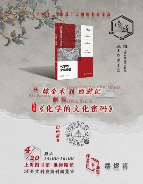 本期“读道”上图新书分享会,我们将为大家带来《化学的文化密码》。该书作者上海理工大学缪煜清教授将亲临现场,带领我们挖掘化学中的文化现象以及化学对文化的深远影响,尽享一场科学与人文交相辉映的文化盛宴!